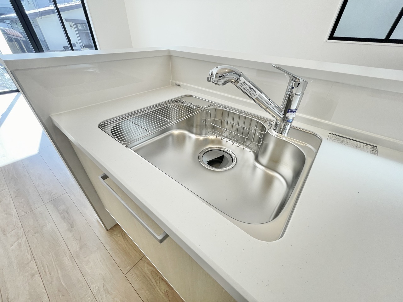 リビングの様子がよく見える対面式オープンシステムキッチン。食洗器や床下収納など嬉しい設備が整っております。