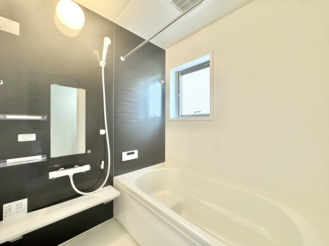窓付きの浴室暖房換気乾燥機付きバスルーム。換気も出来てカビ対策もばっちり