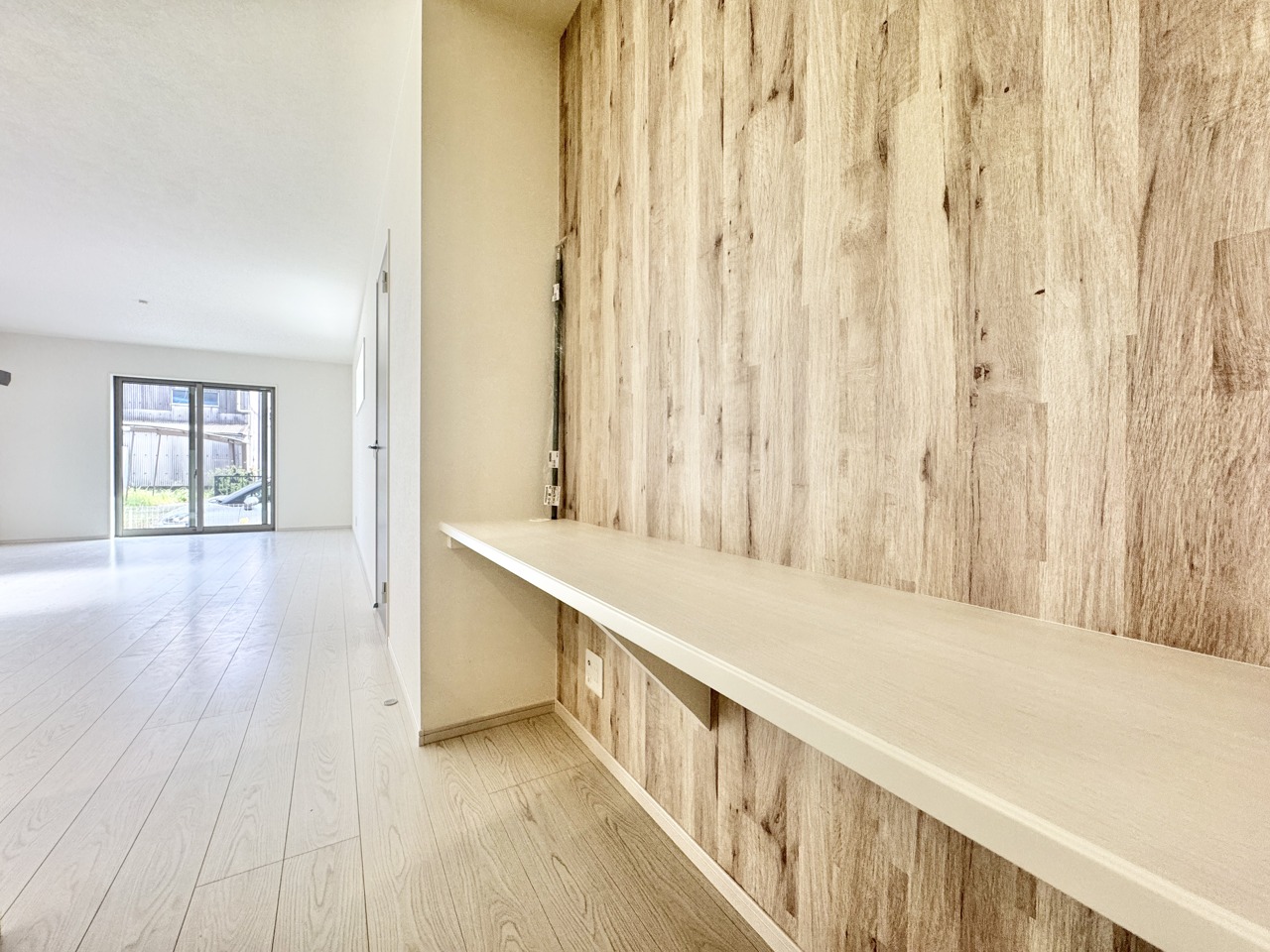 リビング横にはアクセントクロスとリビング学習もできるカウンター付き。観葉植物やその他小物も置くことができます。