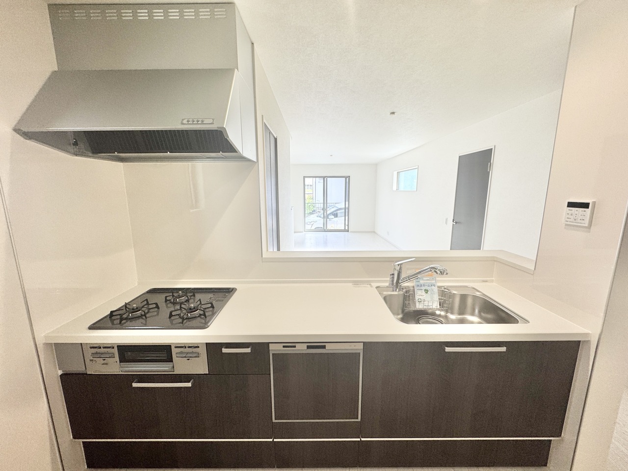 浄水内蔵型水栓、食洗器、3口コンロ、グリル、床下収納のある対面式システムキッチン。LDKの様子が良く見える設計