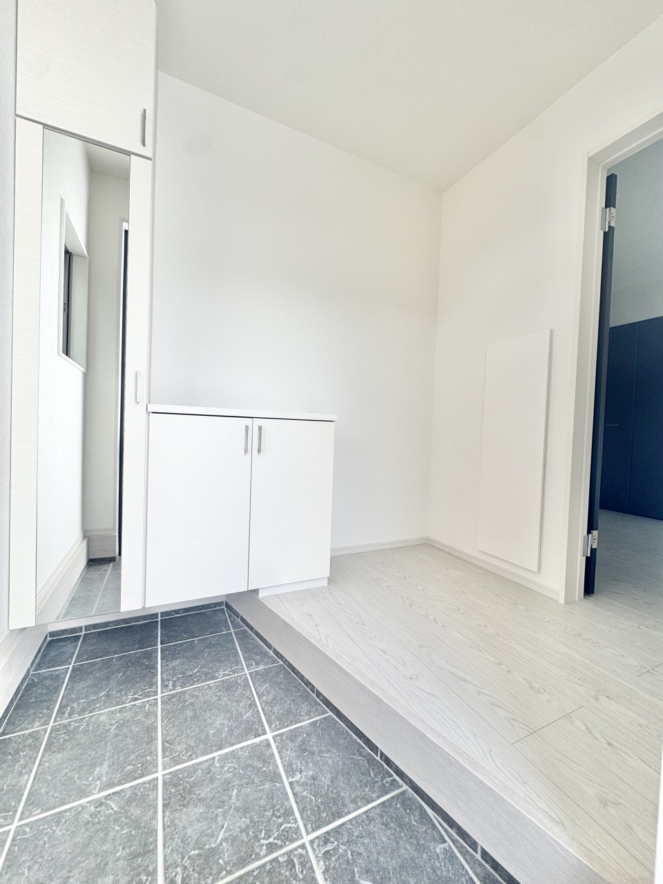 南向きの開放感ある玄関ホール。白で統一された清潔感ある内装となっております。