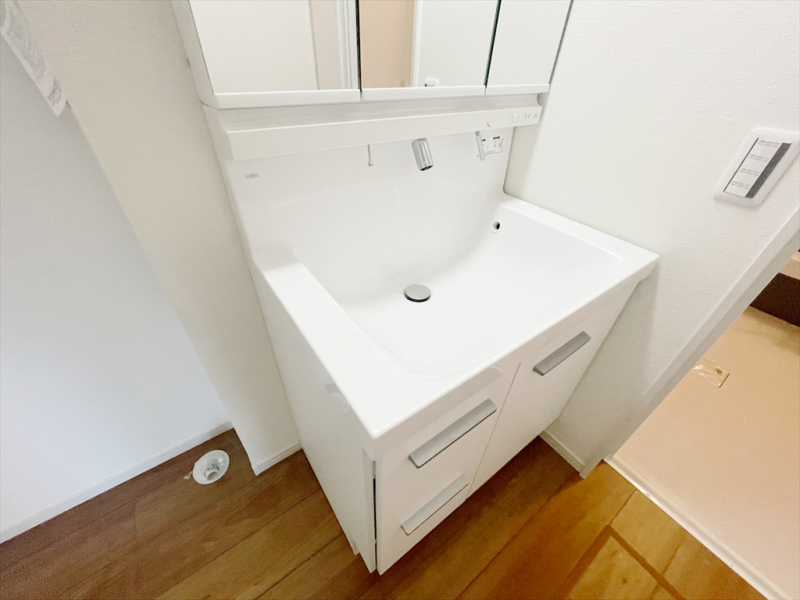 2号棟 ■三面鏡洗面台 シャワーヘッド付き 三面鏡は真正面から見ただけでは気付けない色んな角度から確認でき、収納スペースが豊富であるということがメリットです。また、シャワーヘッド付きの水栓です。ミラー扉の内側がすべて収納スペースになっています。