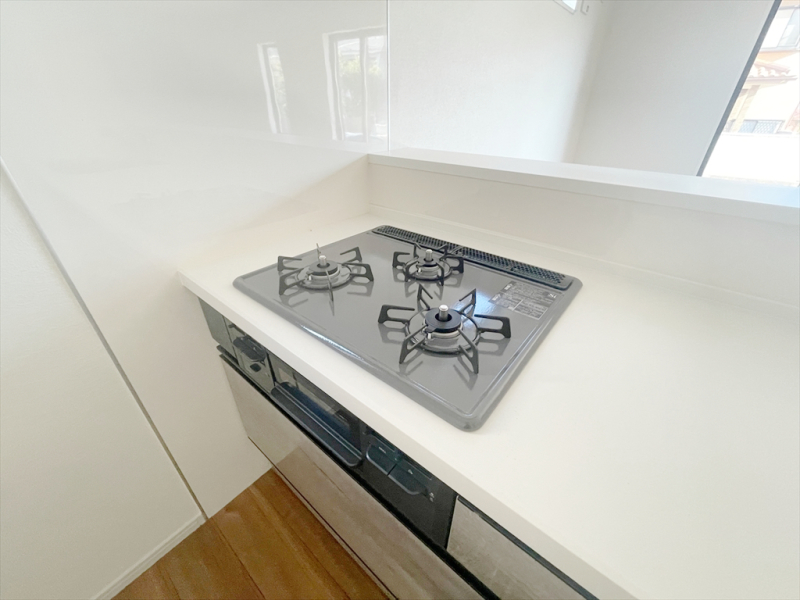 角を極力少なくした、お手入れのしやすい「すっきりクリーンごとく」。3口全てに温度センサーが付き、高温炒め機能付き。片面焼きグリルも搭載しています。消し忘れ消火機能付き、安全で機能的なガスコンロです。