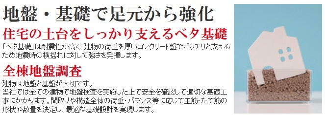 地盤・基礎で足元から強化 住宅の土台をしっかり支えるベタ基礎 「ベタ基礎」は耐震性が高く、建物の荷重を厚いコンクリート盤でガッチリと支えるため地震時の横揺れに対して強さを発揮します。