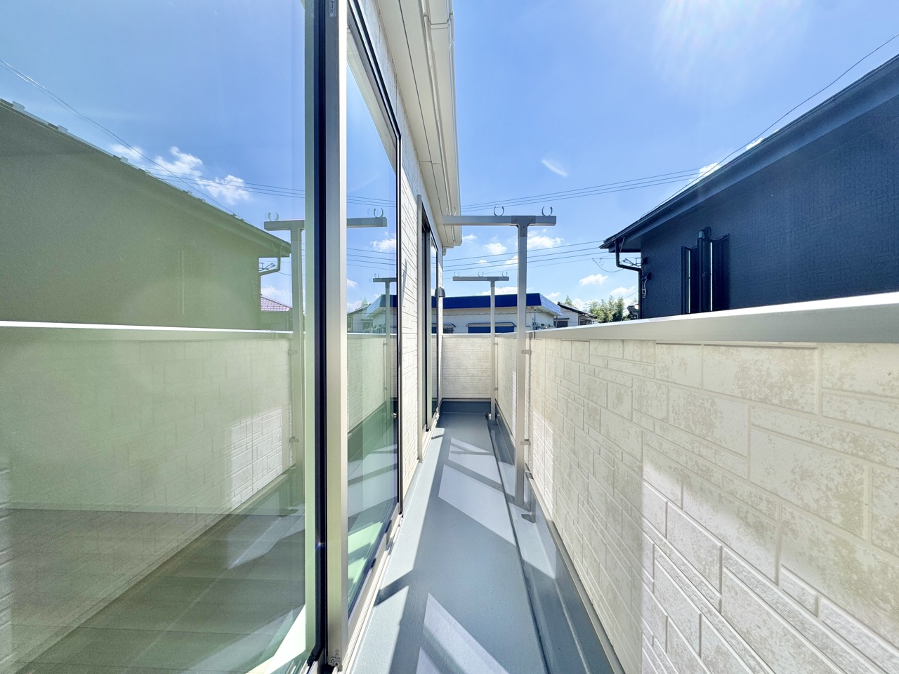 1号棟 陽当たり良好なバルコニーがございます。雨の際は浴室乾燥機がございますので安心出来そうです。