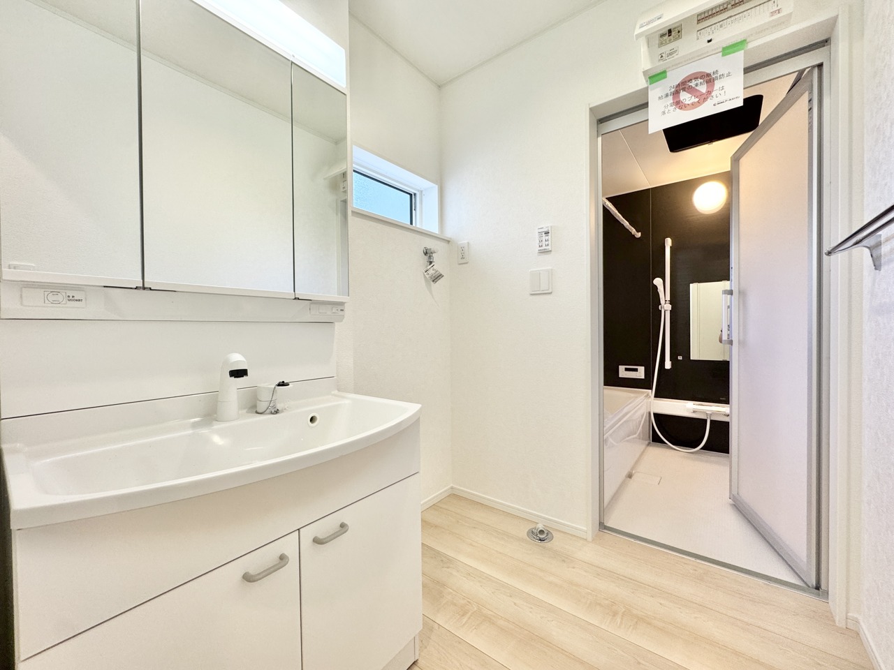 1号棟 3面鏡の洗面台はお支度の際に役立ちます。鏡裏と足元にも収納がございますのでスッキリとお使い頂けます。