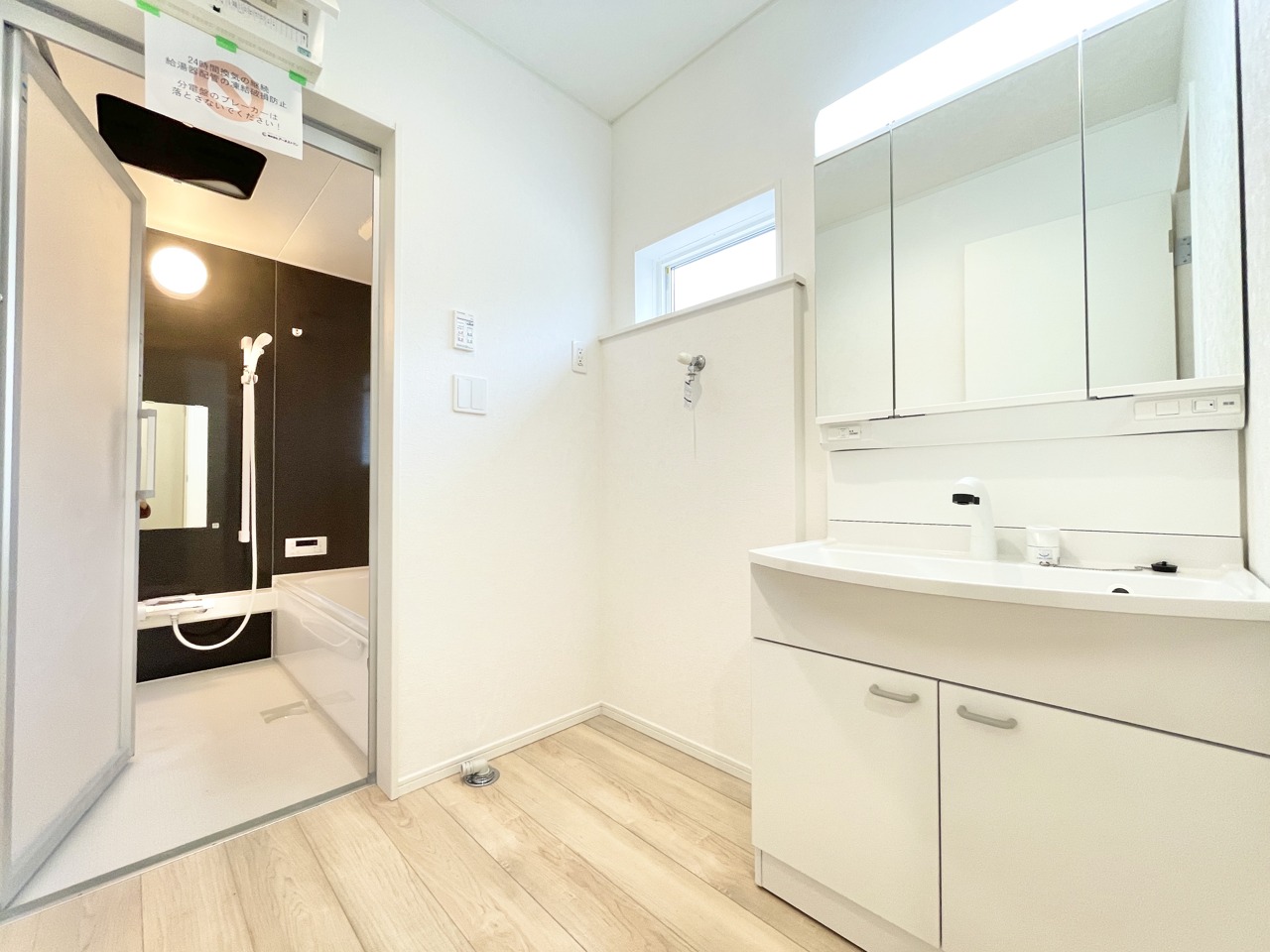 三面鏡は真正面から見ただけでは気付けない色んな角度から確認でき、収納スペースが豊富であるということがメリットです。 また、シャワーヘッド付きの水栓です。