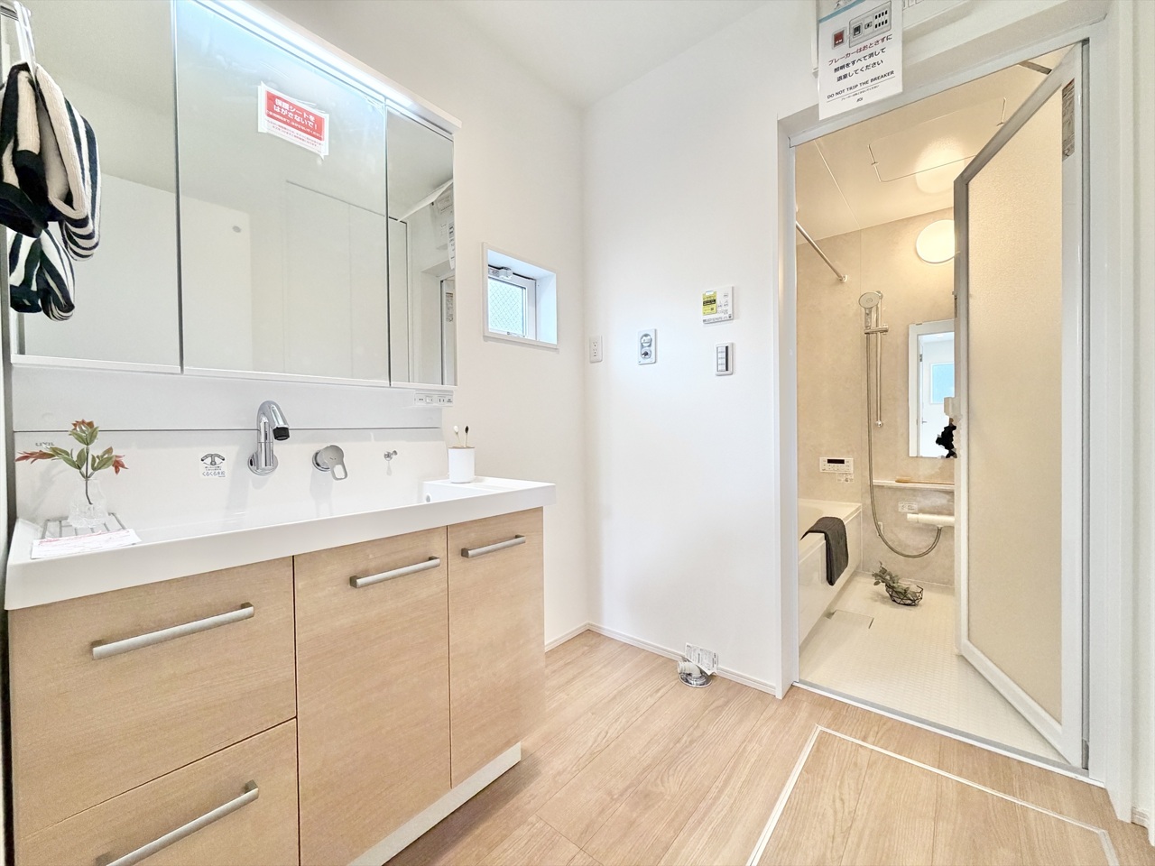 洗面室には、3面鏡の洗面台を完備しております。鏡裏と足元に収納スペースがございますのでスッキリとお使い頂けます。