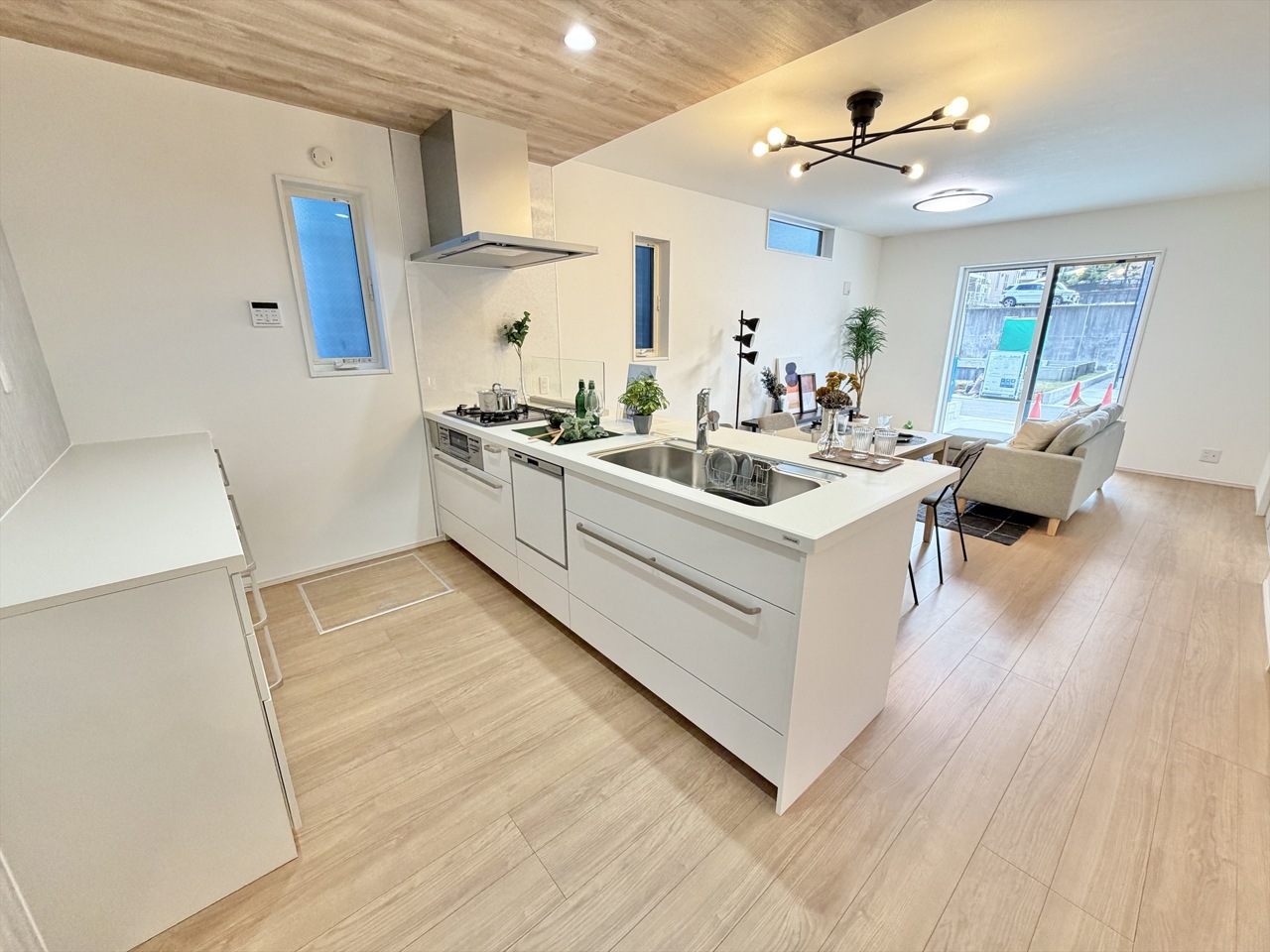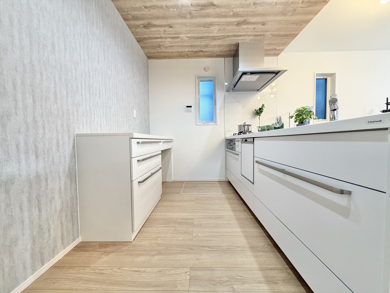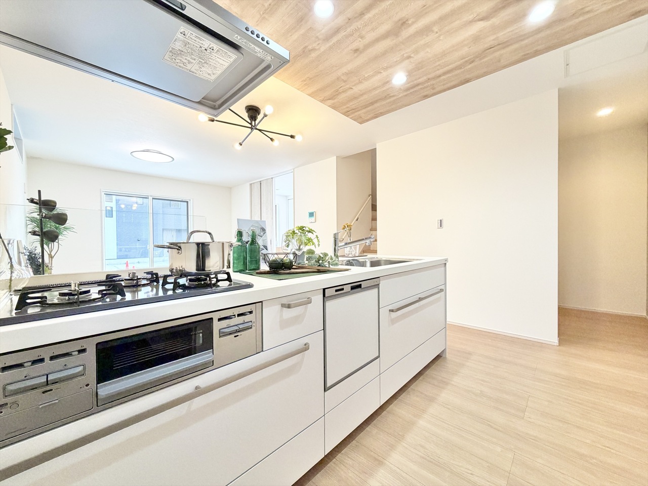 食洗器や3口コンロ、魚焼きグリル等の充実設備を完備しております。足元に加えてカップボードも完備しておりますので、収納力に長けたキッチンとなっております。