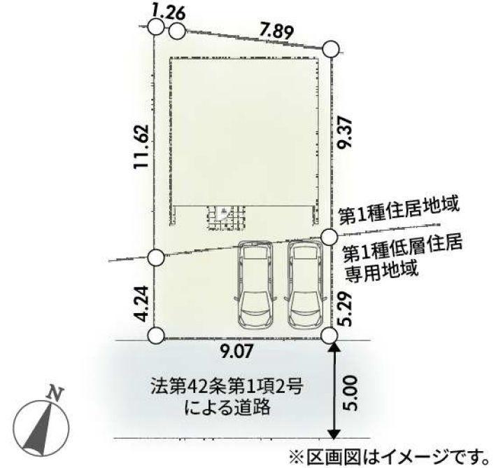 区画図から伝わる“ちょうどいい暮らし”の形。前面道路はゆとりの5m、車2台ゆったり駐車できる整形寄りの敷地。第一種低層の静かな住環境で、家族の毎日がのんびり心地よく過ごせる住まいです。