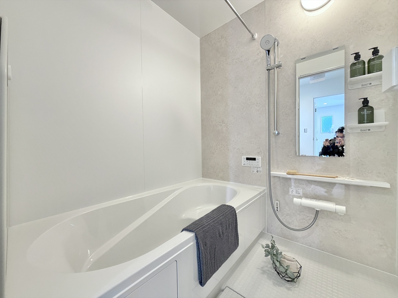 浴室は白を基調とした中に、アクセントを一面取り入れております。落ち着くうえで清潔な印象を与えてくれます。