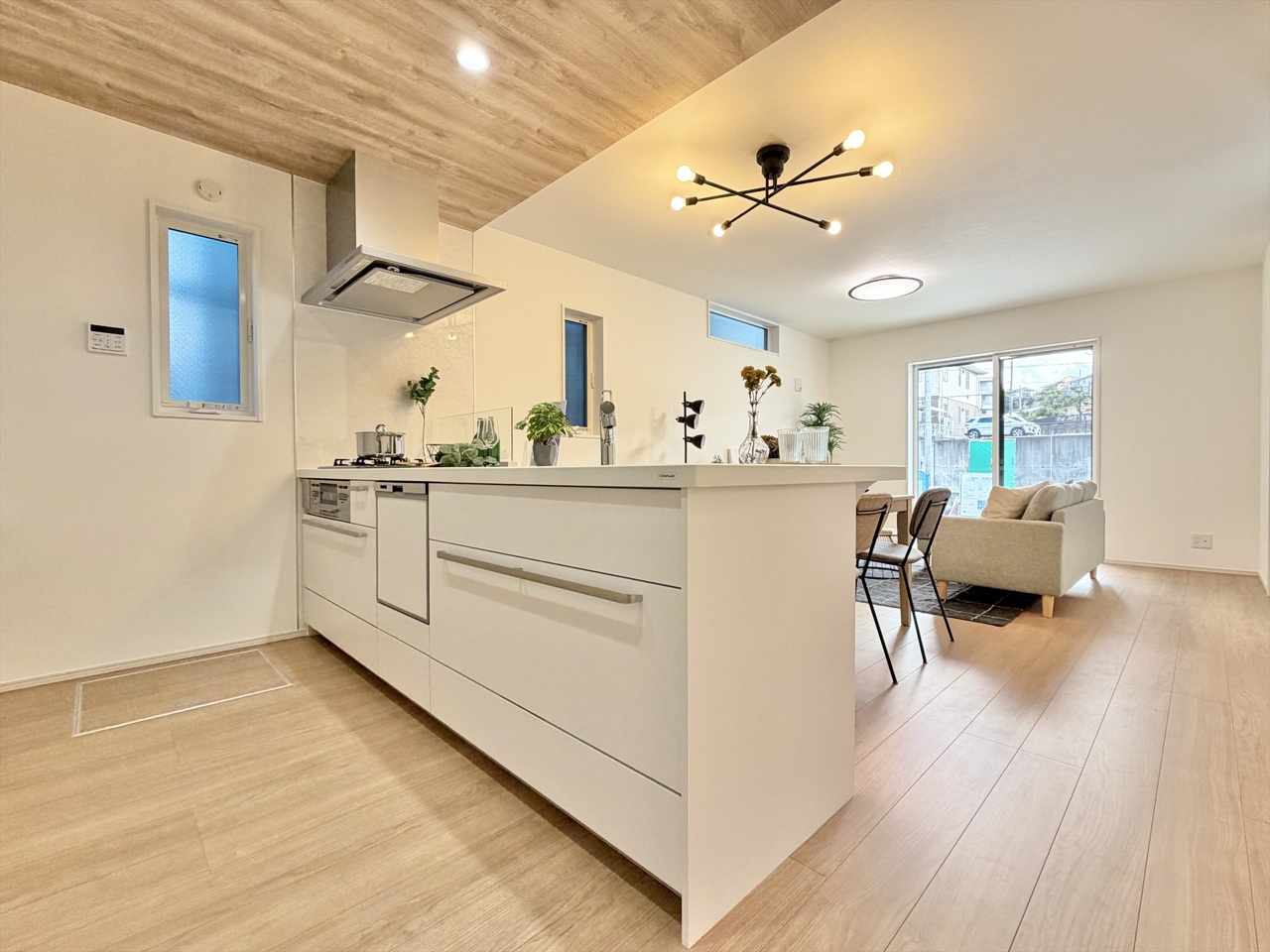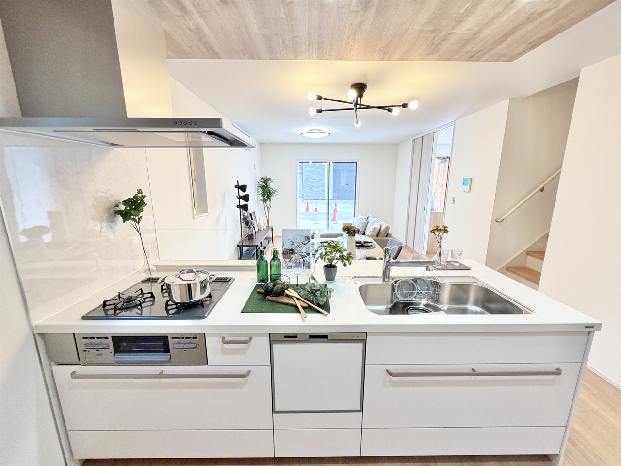 対面式キッチンは家族の会話が増える素敵な間取りです。キッチン後方にはカップボードも標準装備しておりますので収納力に長けております。