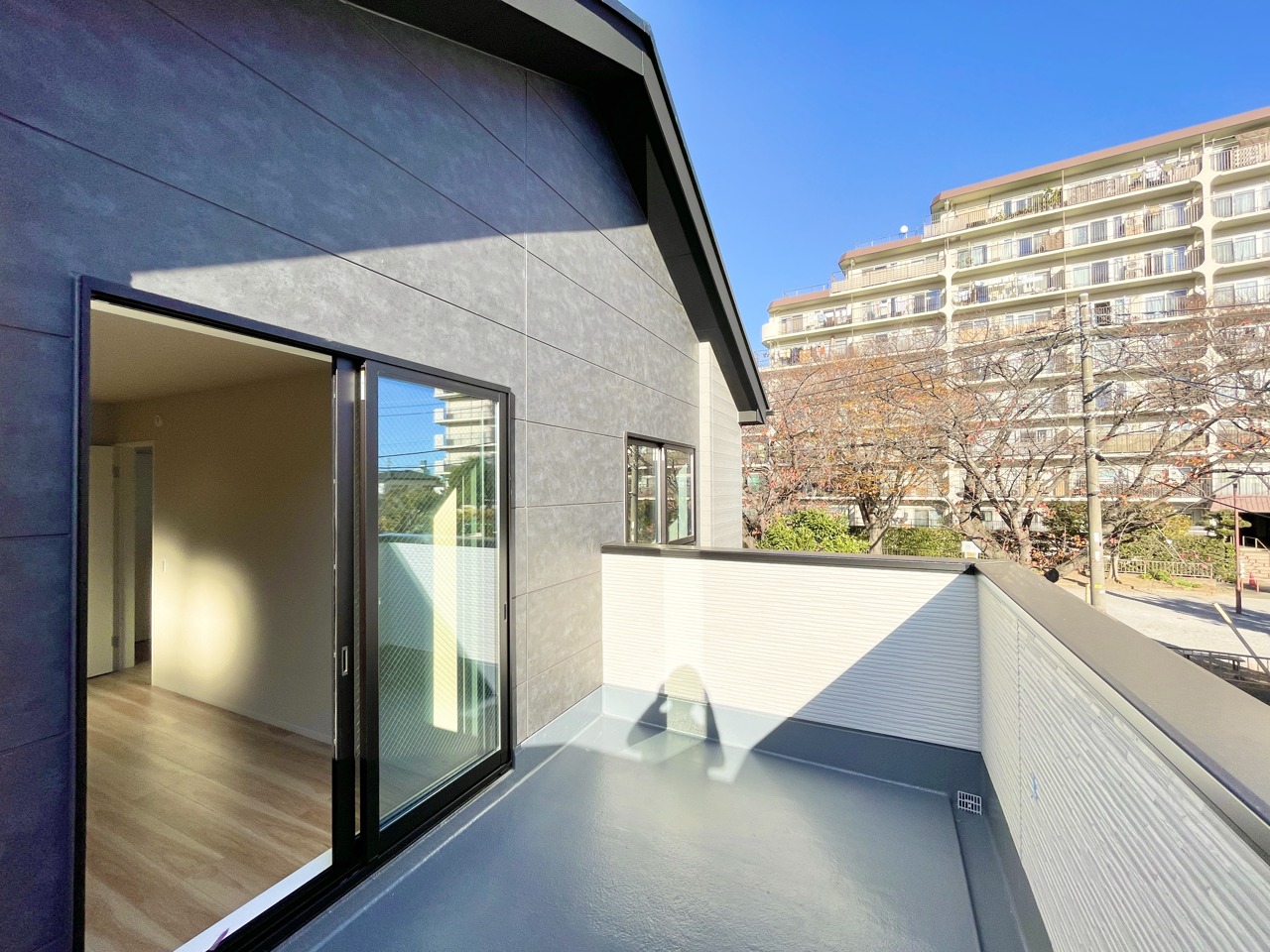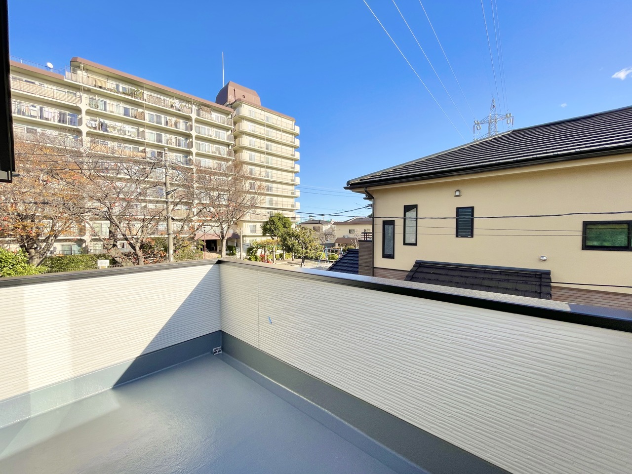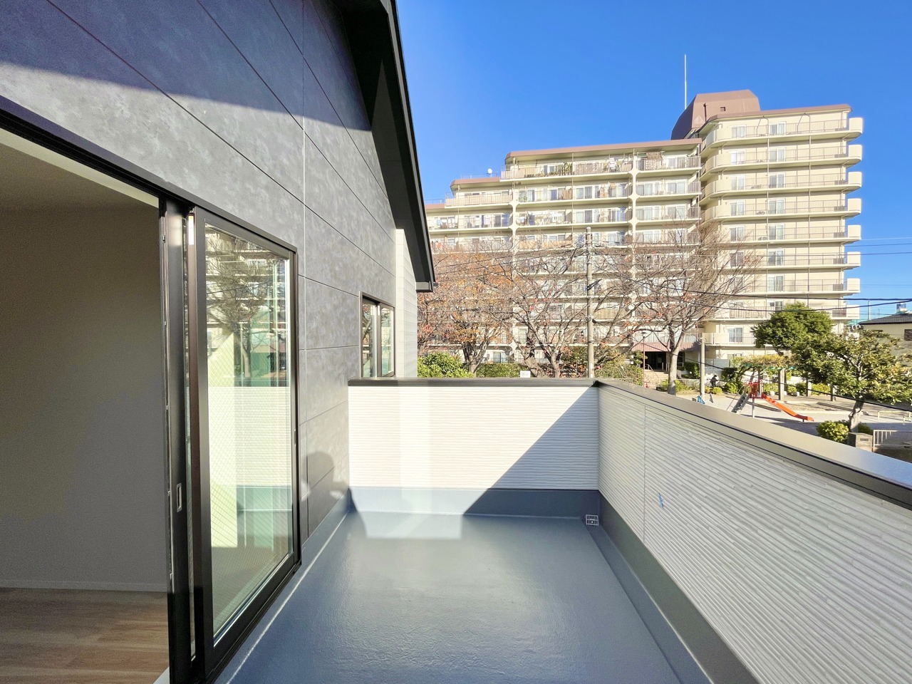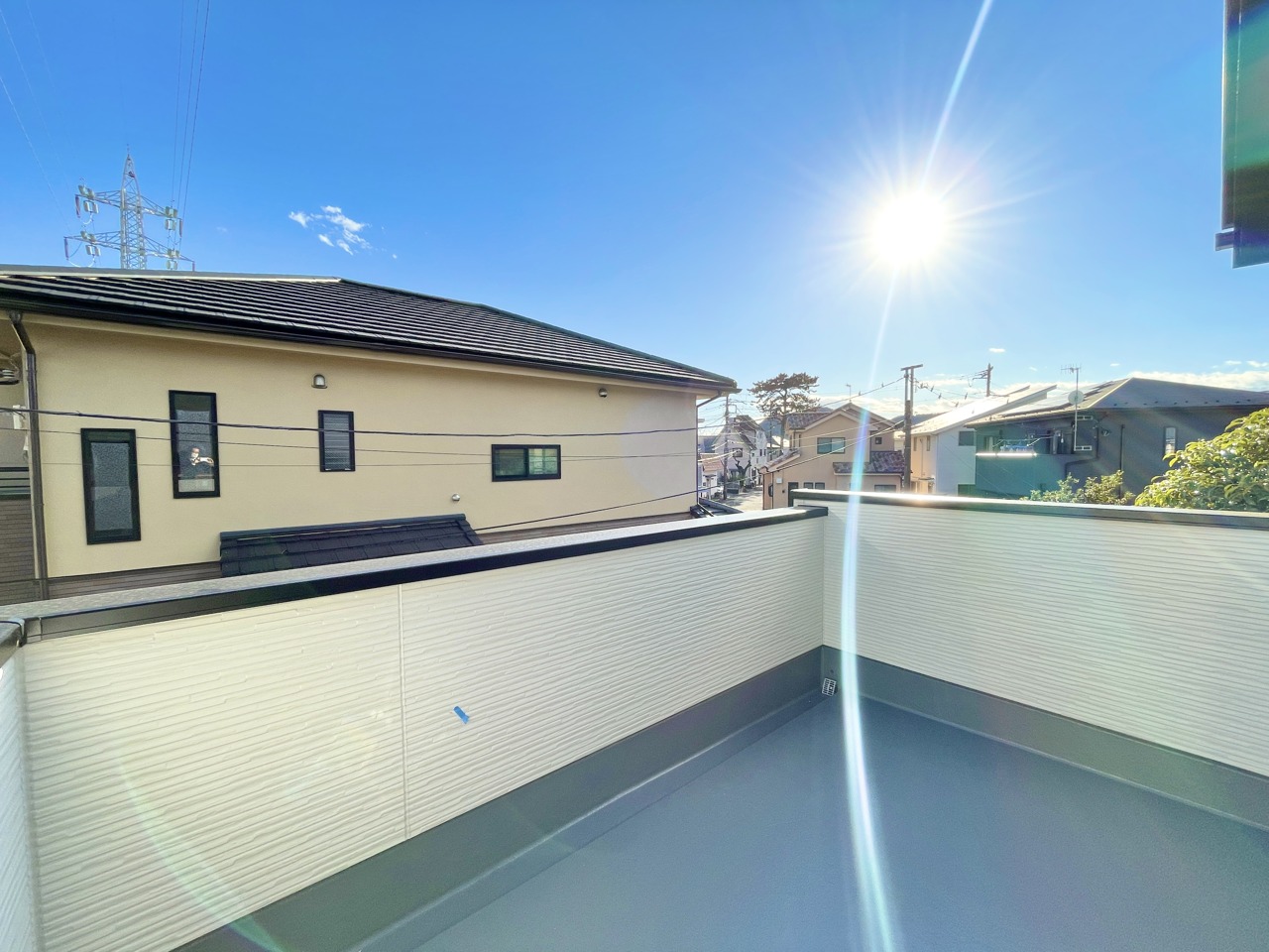 開放感あるバルコニーは2階の約10帖の主寝室と繋がっております。洗濯物も良く乾きそうです。一緒に布団も干せそうですね・