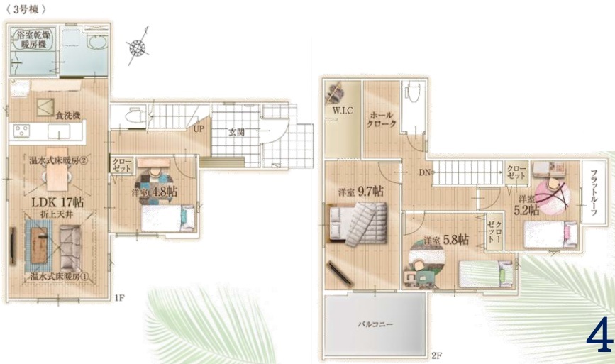 | 間取 | 4LDK (洋室4.8帖、LDK17帖、洋室9.7帖、洋室5.8帖、洋室5.2帖) | ||