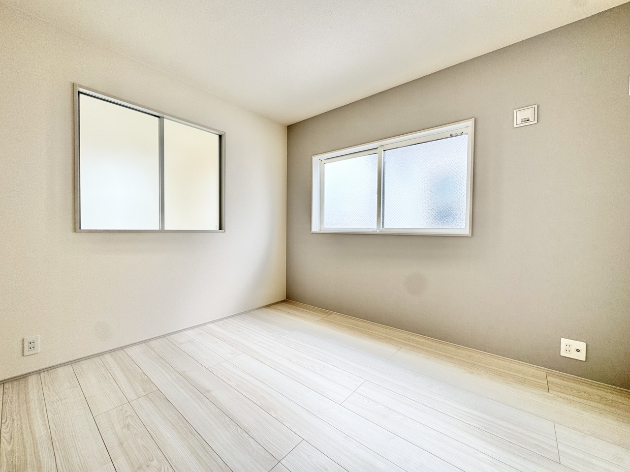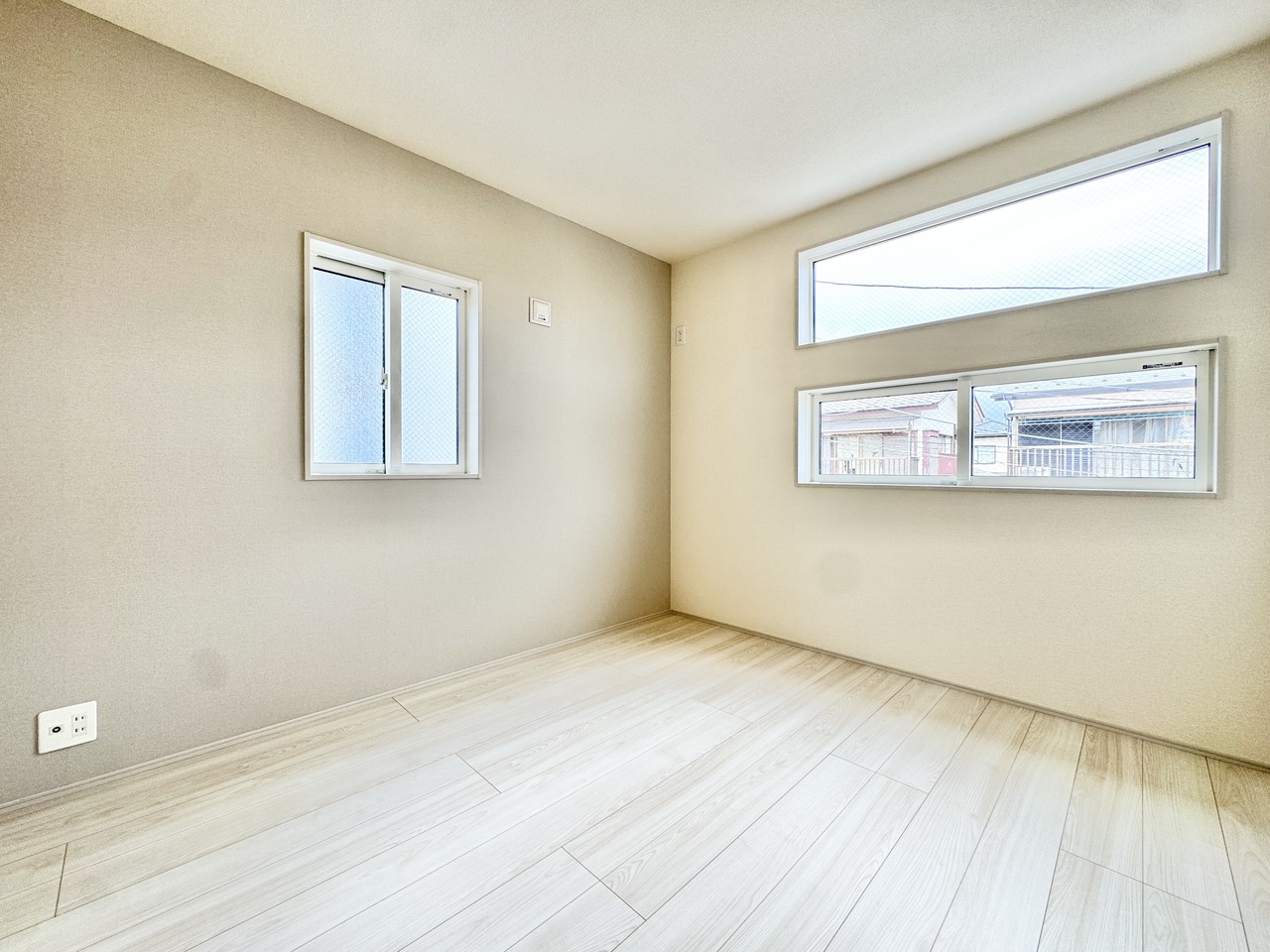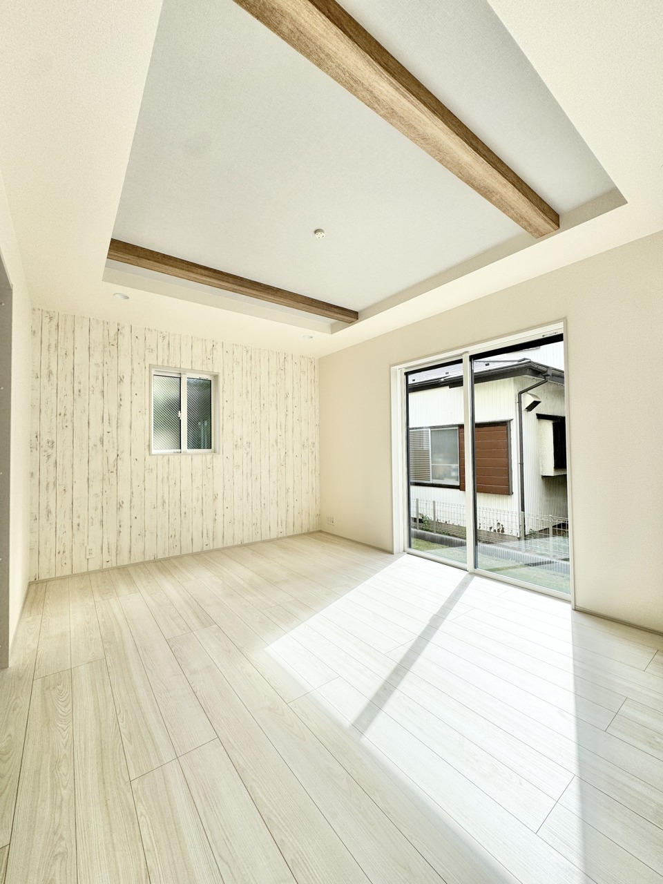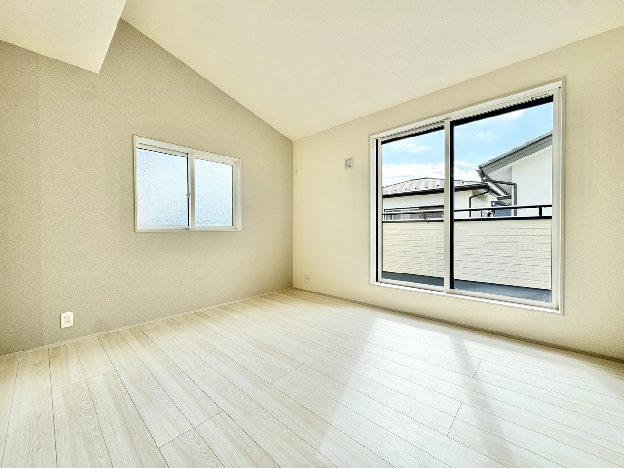 勾配天井による開放感がございます。主寝室7.0帖ございますので広々としておりますね。アクセントクロスはお部屋の雰囲気を引き立て、デザイン性の高い空間に仕上げています。