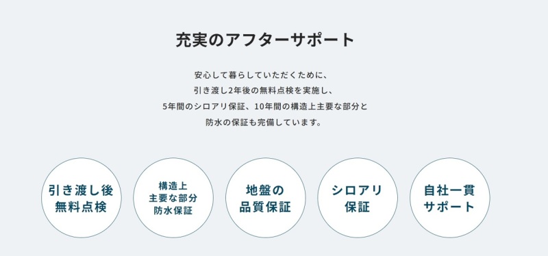 安心して暮らしていただくために、引き渡し2年後の無料点検を実施し、5年間のシロアリ保証、10年間の構造上主要な部分と防水の保証も完備しています。 《引き渡し後無料点検・構造上主要な部分の防水保証・地盤の品質保証・シロアリ保証など》