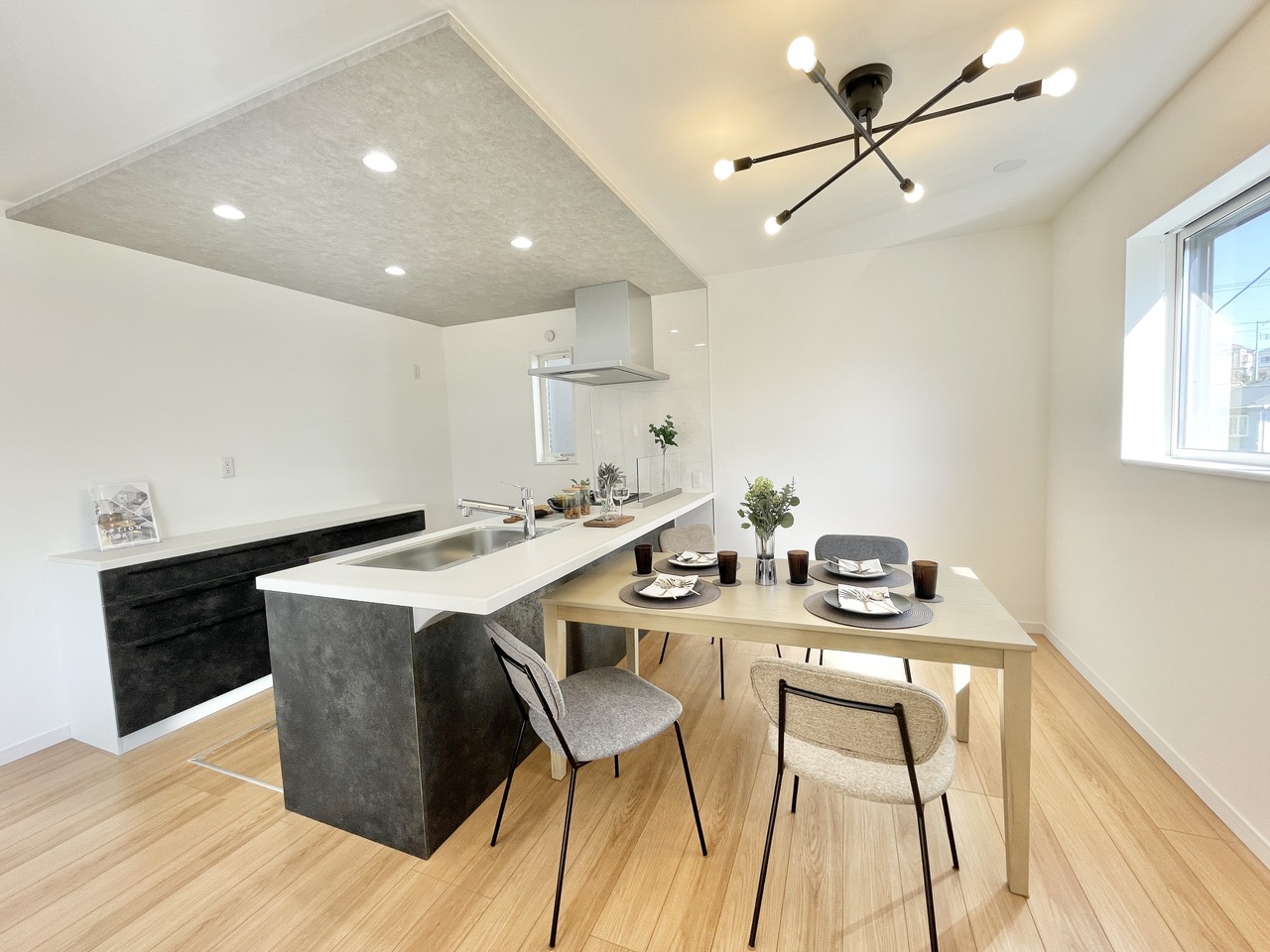 4号棟 リビングとキッチンがほどよくつながる間取りで、家族のコミュニケーションが自然と生まれる住まいです。お子様の様子を見守りながら調理ができます。 家族団らんの時間をゆったりお過ごしください♪