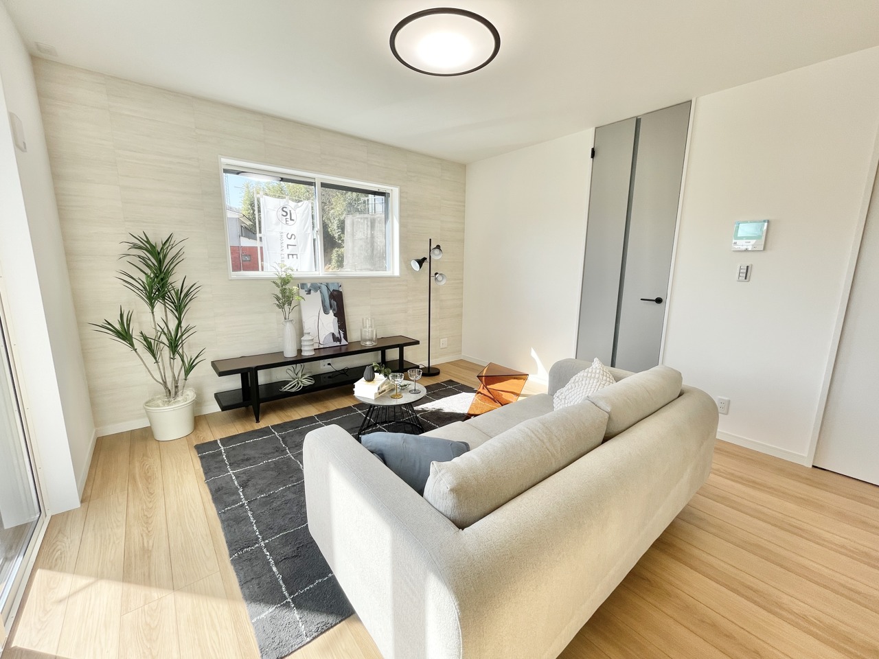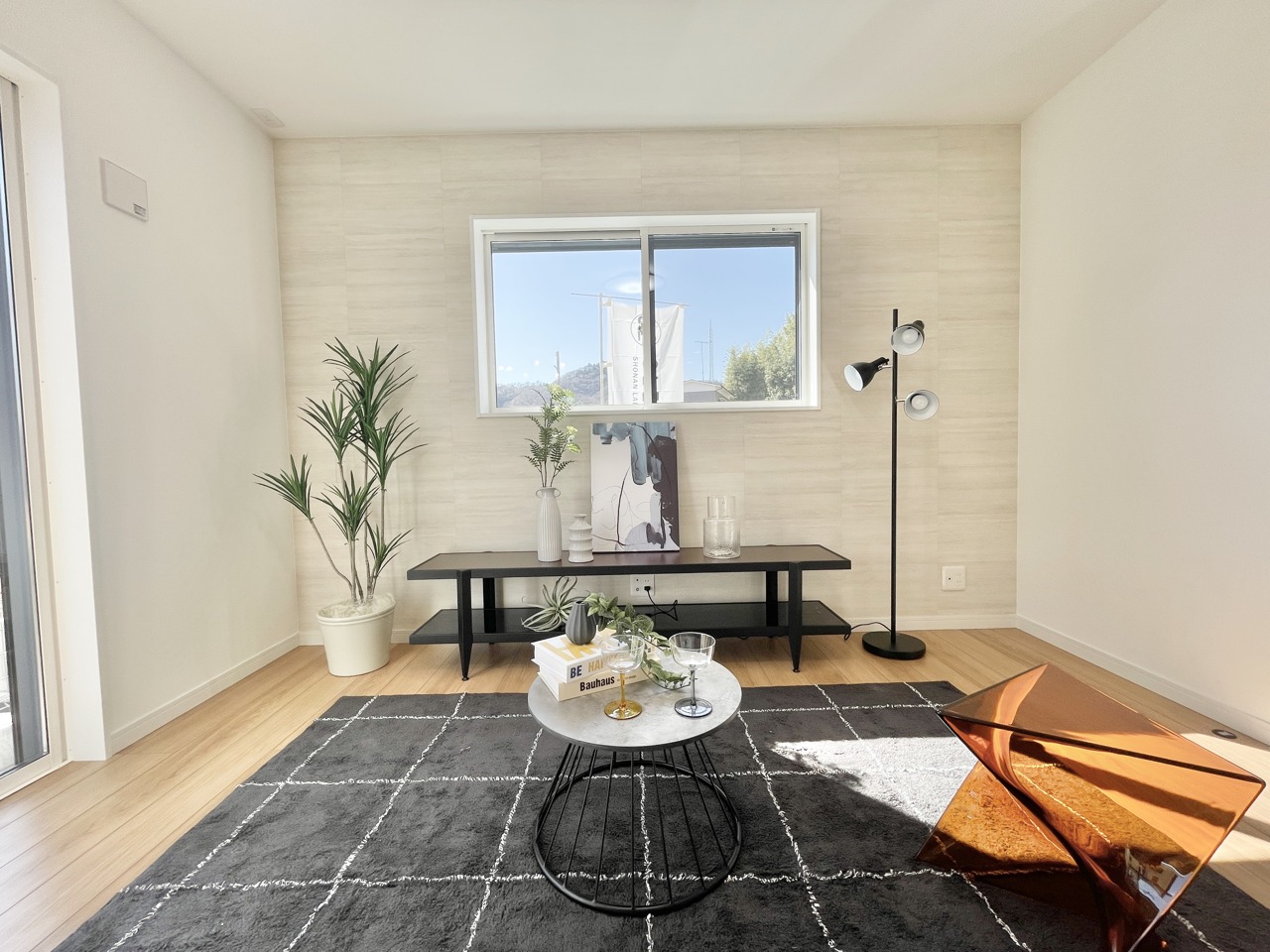4号棟 大きな窓から光がたっぷり差し込む、明るく開放的なリビング。どこにいても家族の気配を感じられる、ゆったりとした心地よい空間です。ここから新しい毎日が始まります。 家具が設置されイメージしやすいです。※家具はつきません。