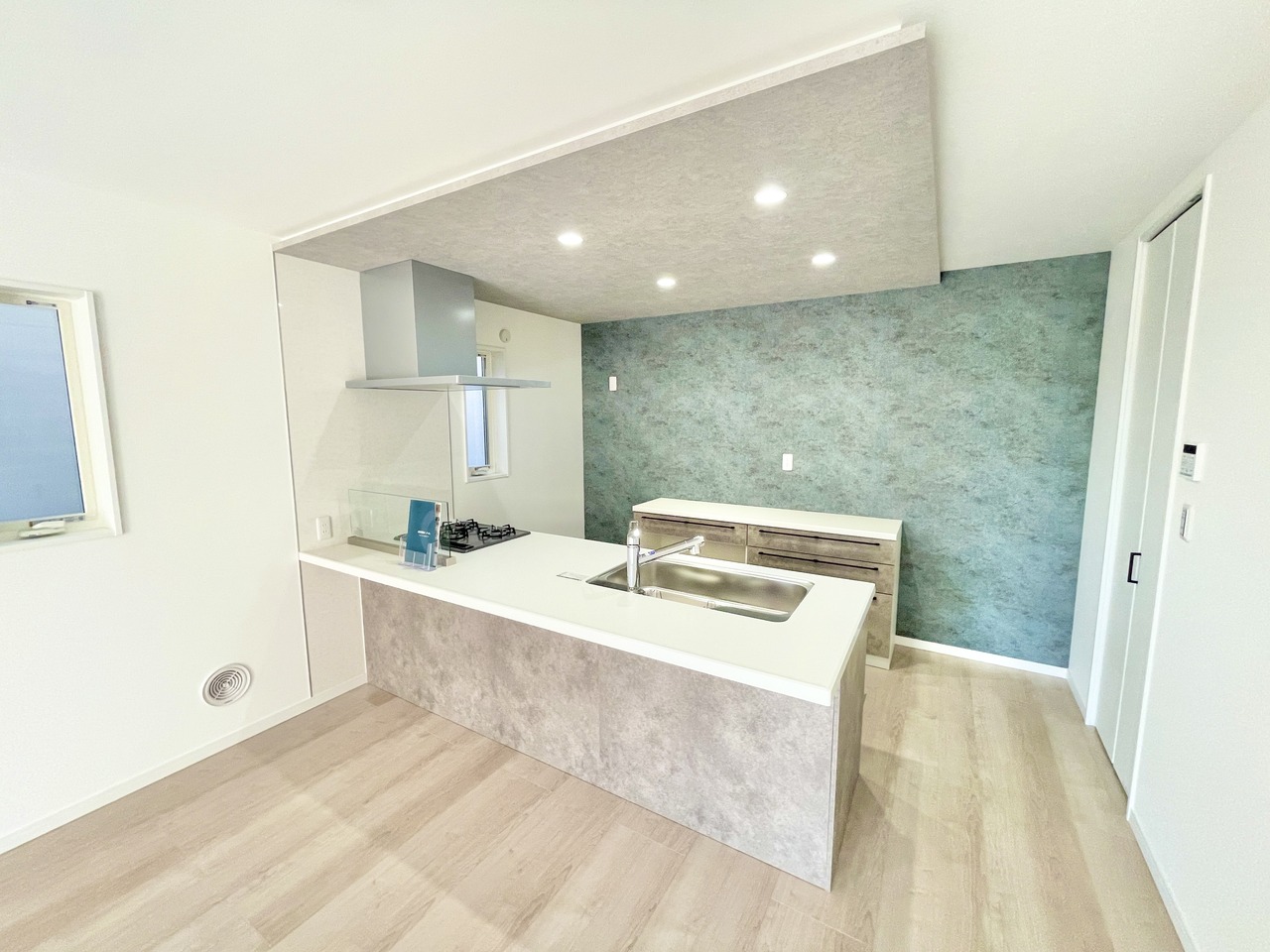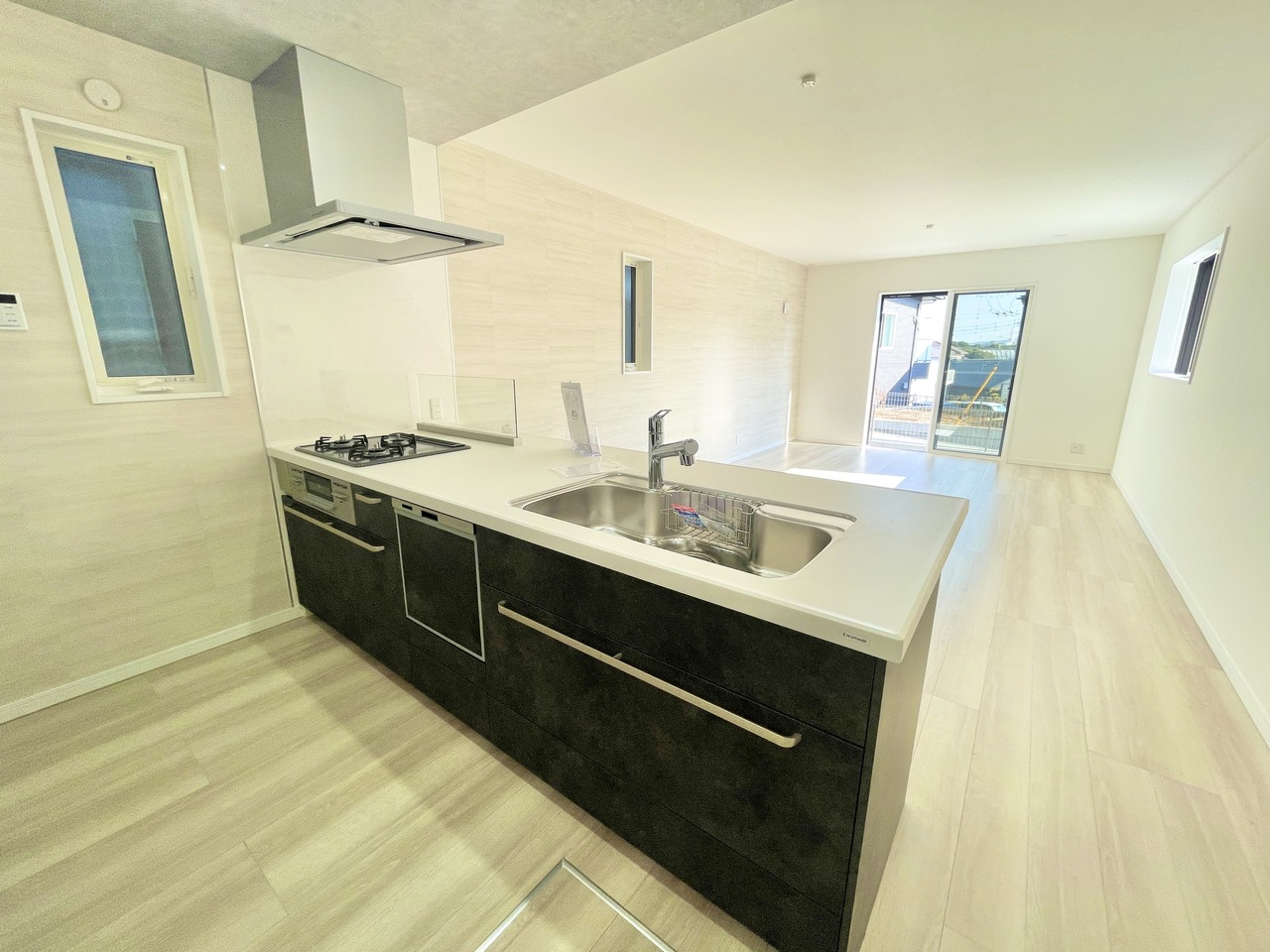 3号棟 天板90センチのペニンシュラキッチンが特徴で人気のある新築戸建。嬉しいカップボード標準仕様でキッチン周りが充実 2026/01/26m
