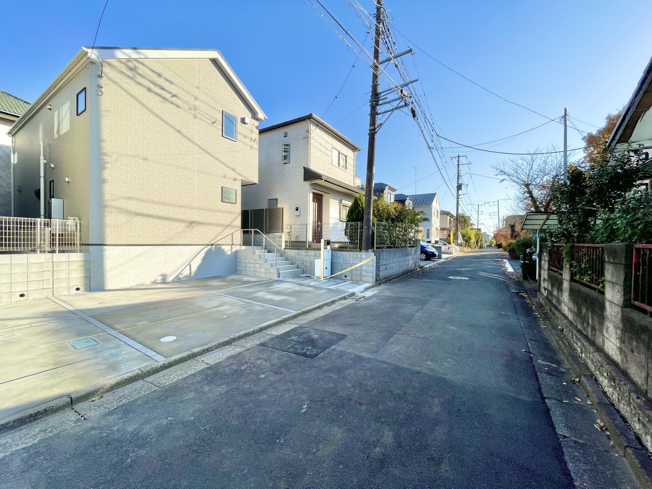 西側の前面道路は約4.5mで交通量は少なめです。カースペースは2台で、駐車もストレス少なくいただけます。