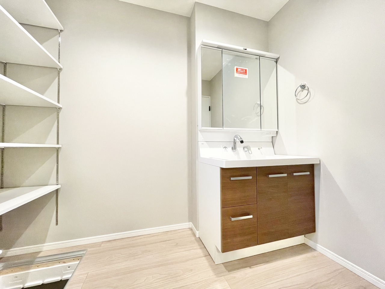 ゆとりある洗面化粧台スペース。洗面化粧台スペースには稼働棚が標準でついており、収納も豊富です。
