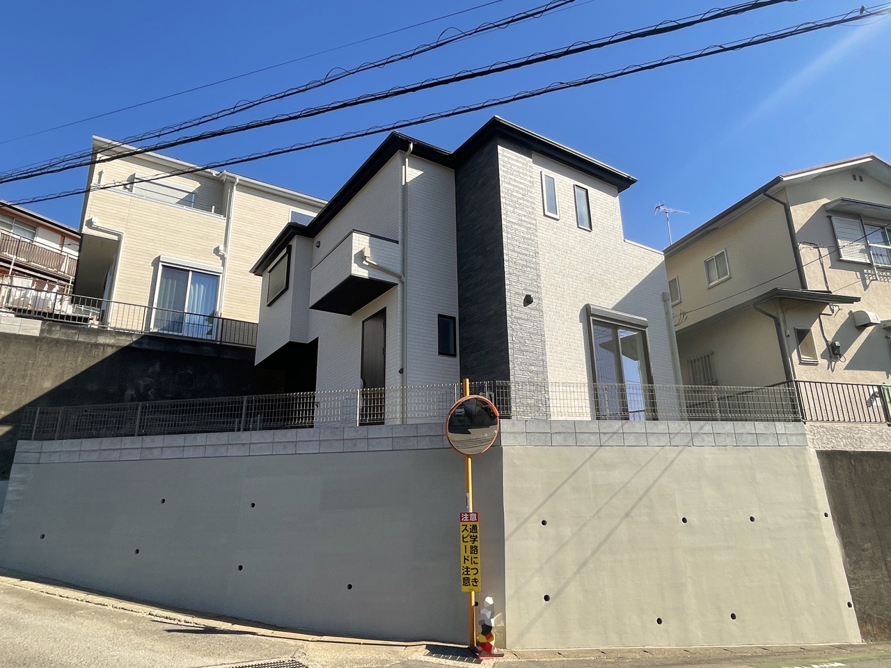 道路面から一段高く、角地のため開放的な雰囲気を感じることができる邸宅となっています。