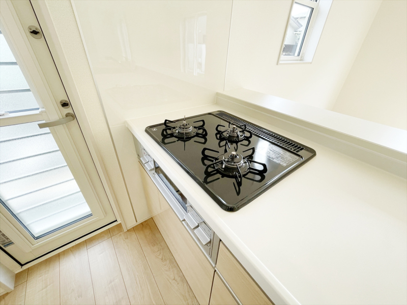 角を極力少なくした、お手入れのしやすい「すっきりクリーンごとく」。3口全てに温度センサーが付き、高温炒め機能付き。片面焼きグリルも搭載しています。消し忘れ消火機能付き、安全で機能的なガスコンロです。