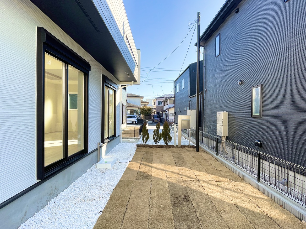 落ち着いた街並みに映える、スタイリッシュで頼もしい佇まいの1号棟。広い窓からは明るい光が差し込み、家族の毎日を心地よく包みます。収納も動線も使いやすく、初めてのマイホームにもぴったりな“ちょうどいい”住み心地の一邸です。