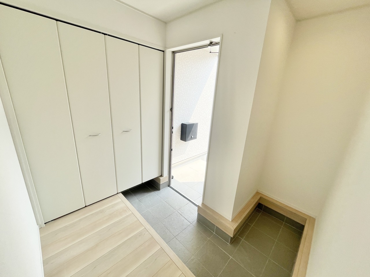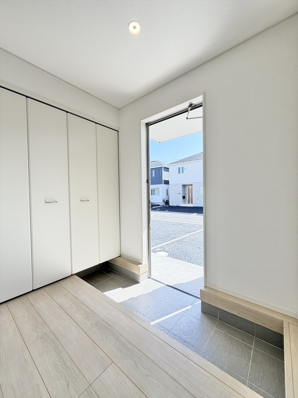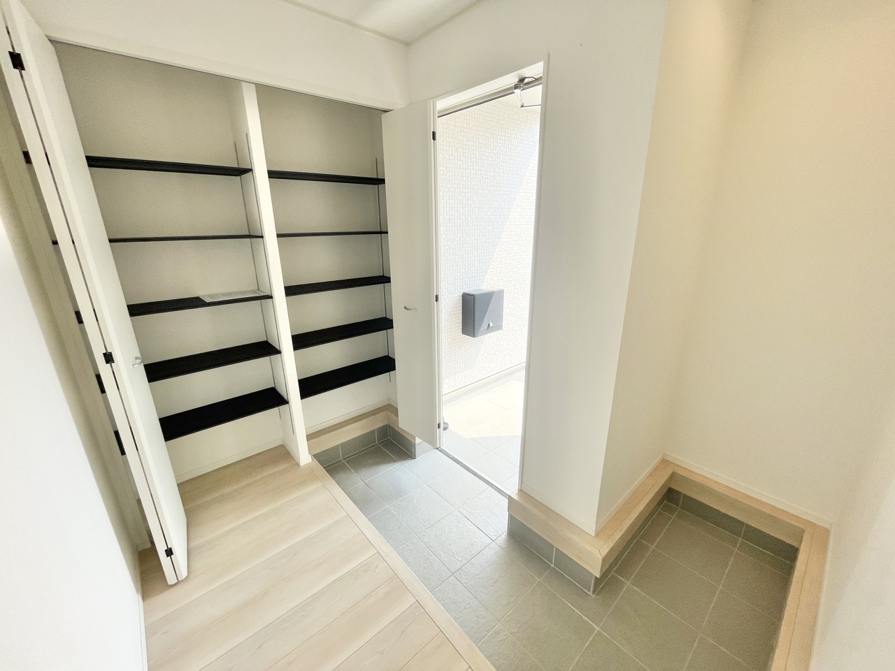 3号棟 ベビーカーやゴルフバッグも置けるゆとりの玄関収納付き。