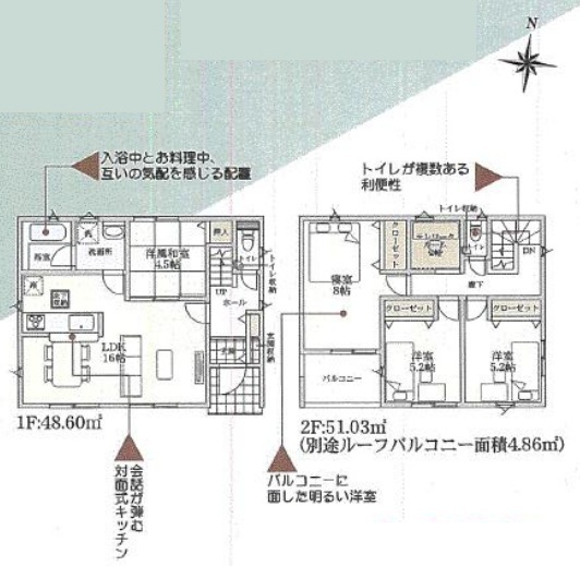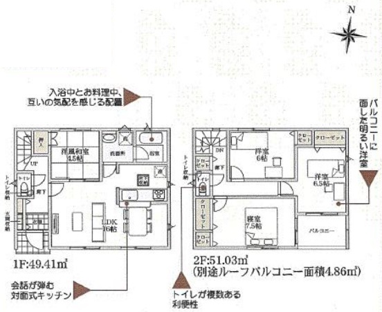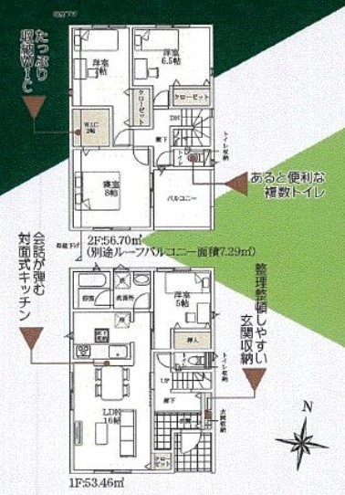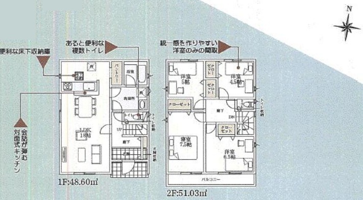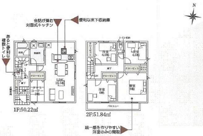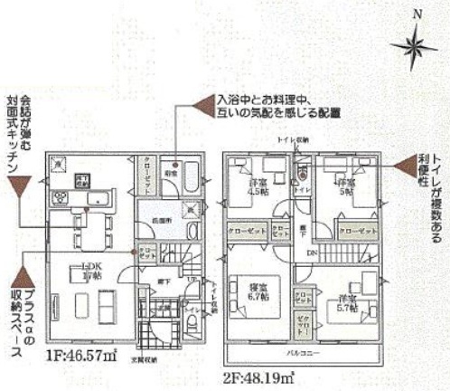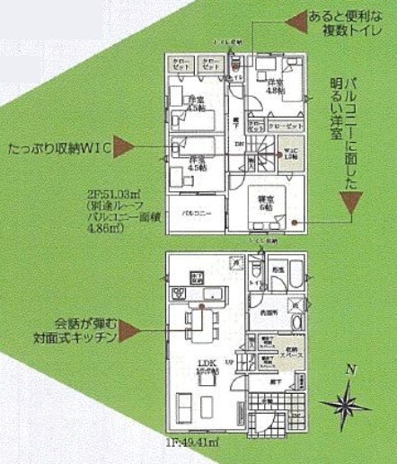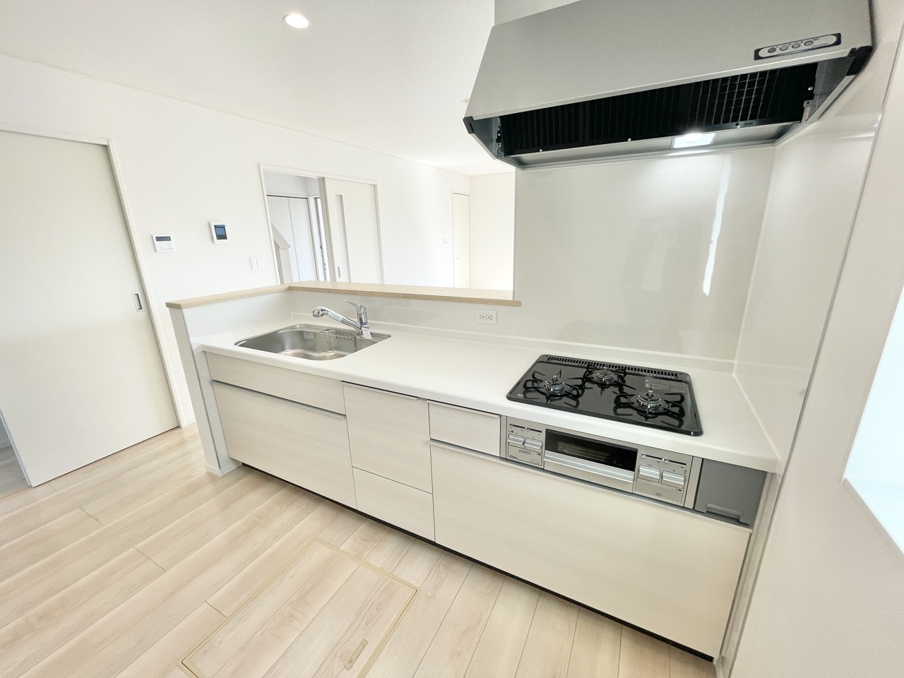 | 設備 | 公営水道、本下水、個別LPG プロパンガス,システムキッチン,カウンターキッチン,浄水器,トイレ2箇所,温水洗浄便座,浴室乾燥機,複層ガラス,床下収納,ディンプルキー,モニター付きインターホン,火災警報器等設置済,セットバック |