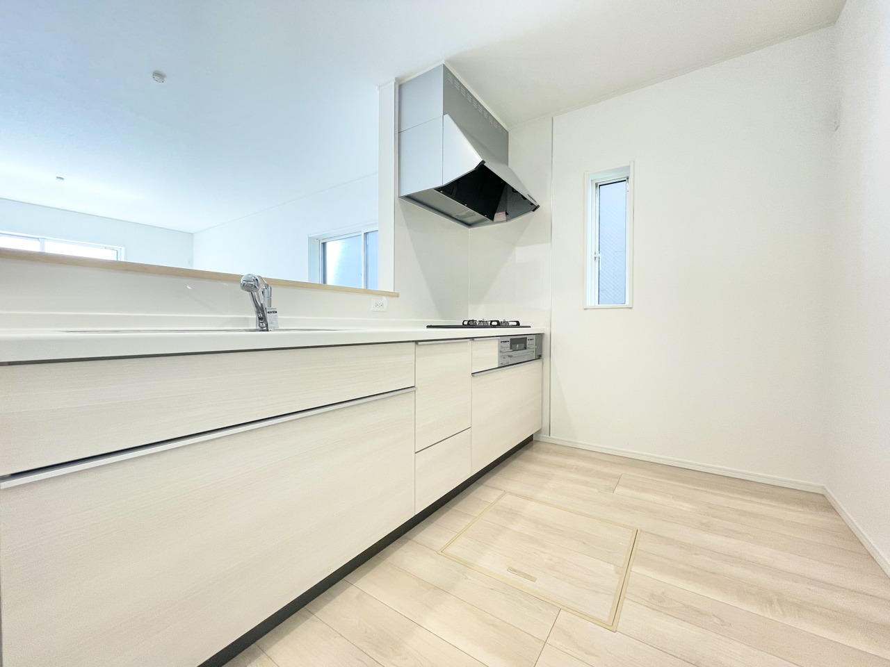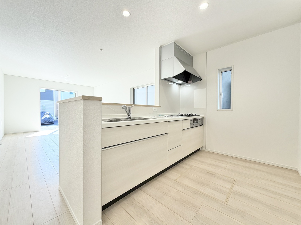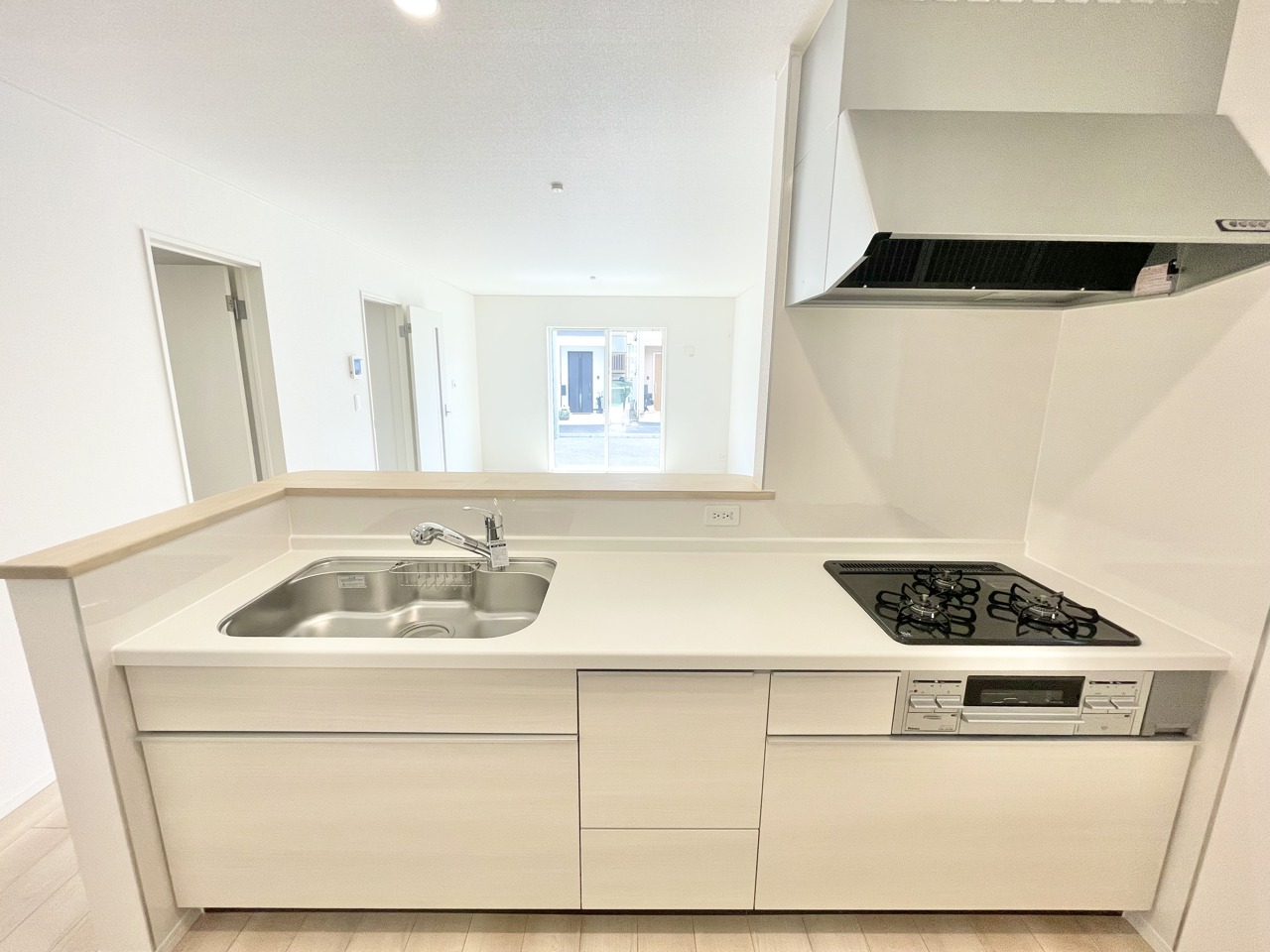 3号棟 調理道具や食器、調味料などがしっかり収まる豊富な収納を確保。キッチンまわりをいつでもスッキリと保てるため、急な来客時にも慌てる心配がありません。