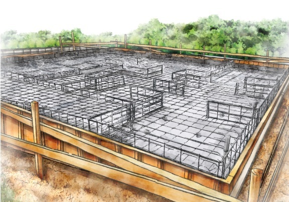 剛性・耐久性にすぐれた施工方法 ベタ基礎は、コンクリートで建物の下一面を支える工法。基礎鉄筋を張り強度を強めたベタ基礎の耐圧盤を1階の床下全面に施工し、広い耐圧盤の面で建物の荷重を地盤に伝えます。