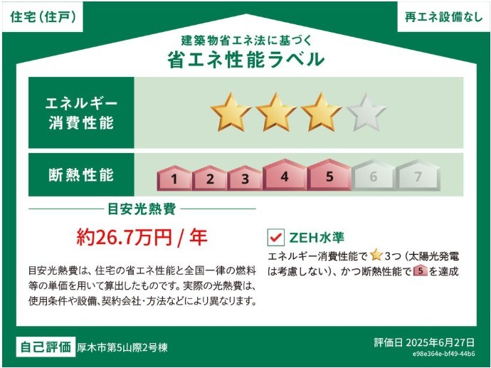 | 省エネ性能表示 | エネルギー消費性能:★★★ 断熱性能:5段階 目安光熱費:約26.1万円/年 |