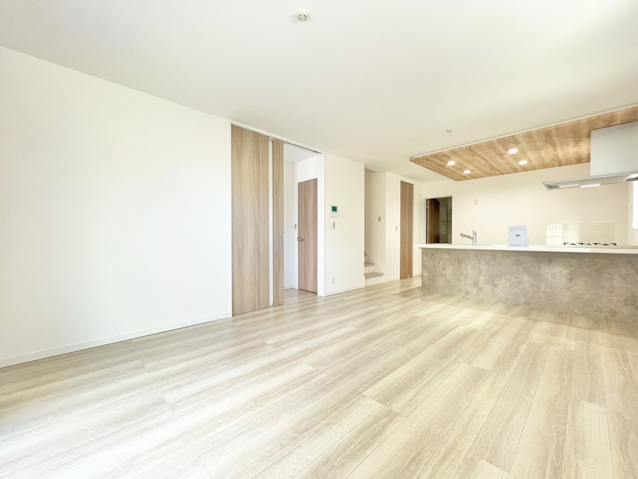 明るく開放的な空間を作るため、仕切りのないペニンシュラキッチンに。料理しながら会話ができたり、キッチンからリビングまで目が届くことでお互いの気配をいつも身近に感じられる、暮らしが豊かになるLDK。