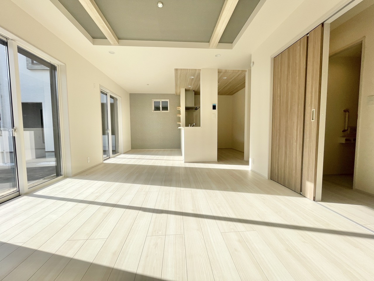 2号棟 木目調の天井がアクセントになった、温かみのあるリビングダイニング。大きな窓から優しい光が入り、明るく開放感のある空間です。キッチンはリビングが見渡せる対面式で、家事をしながらご家族との時間を楽しめます。