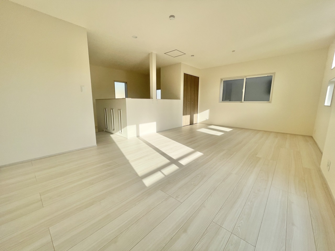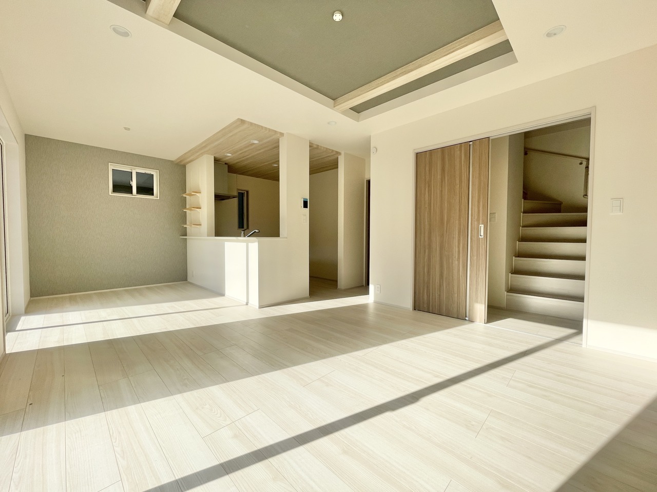 2号棟 明るい光がたっぷり差し込む広々リビングは、家族みんながのびのび過ごせる心地よい空間。キッチンや階段への動線もスムーズで、毎日の暮らしがもっと快適に。自然と会話が生まれる、あたたかい住まいです。 2026/02/23m