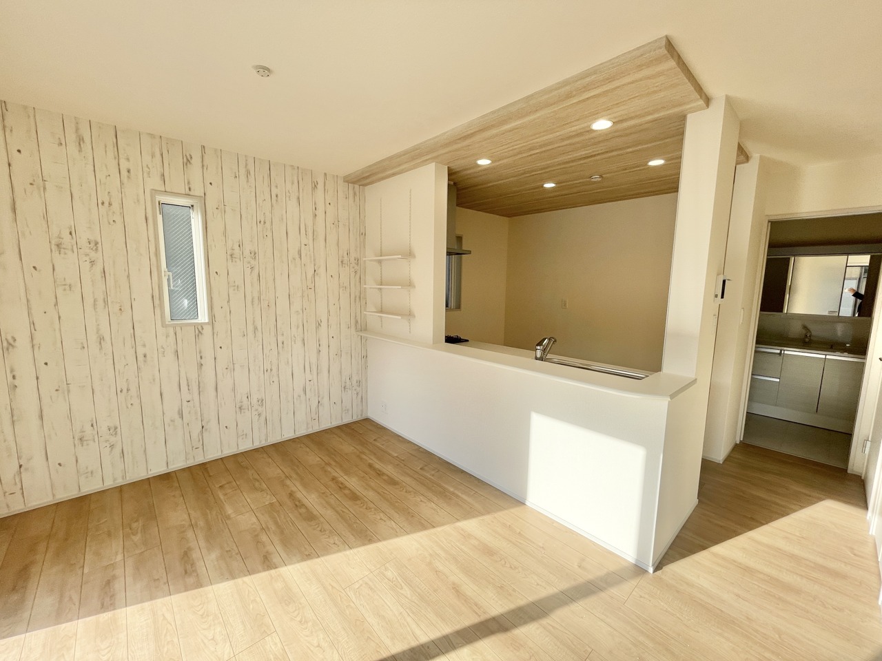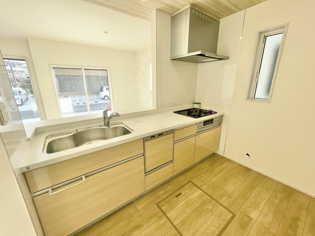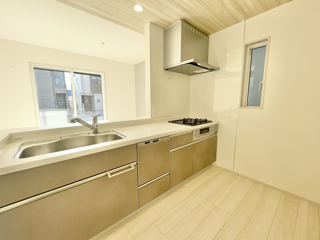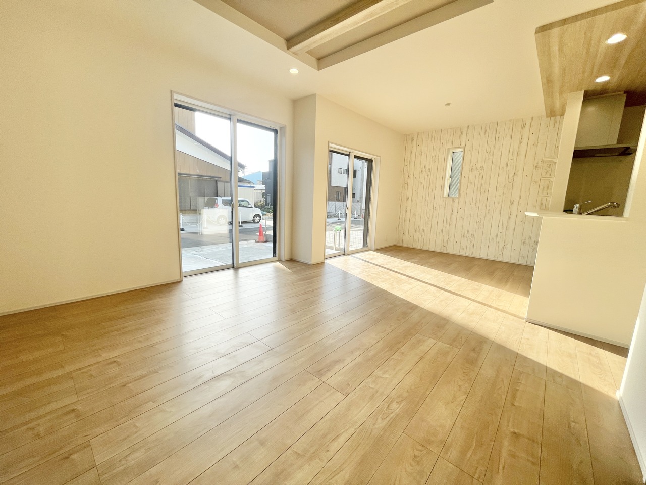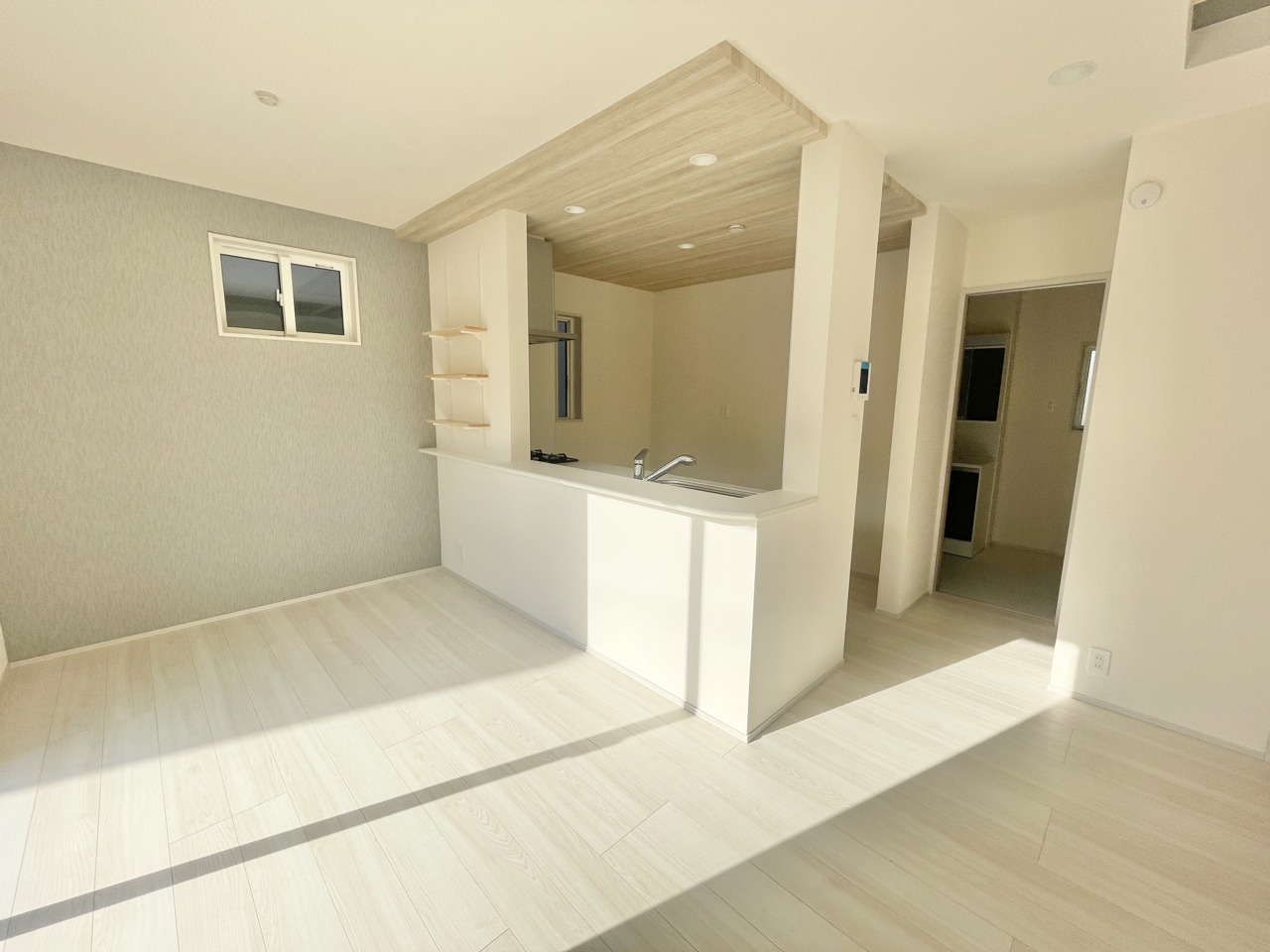 2号棟 明るい光がたっぷり差し込むリビングは、家族みんなが自然と集まる心地よい空間。木目調の床と落ち着いた色合いのキッチンが、毎日の時間をやさしく包み込みます。ゆったり広さがあり、家具の配置もしやすい間取り。くつろぎも団らんも思いのままに楽しめる、居心地のよいのリビングです。