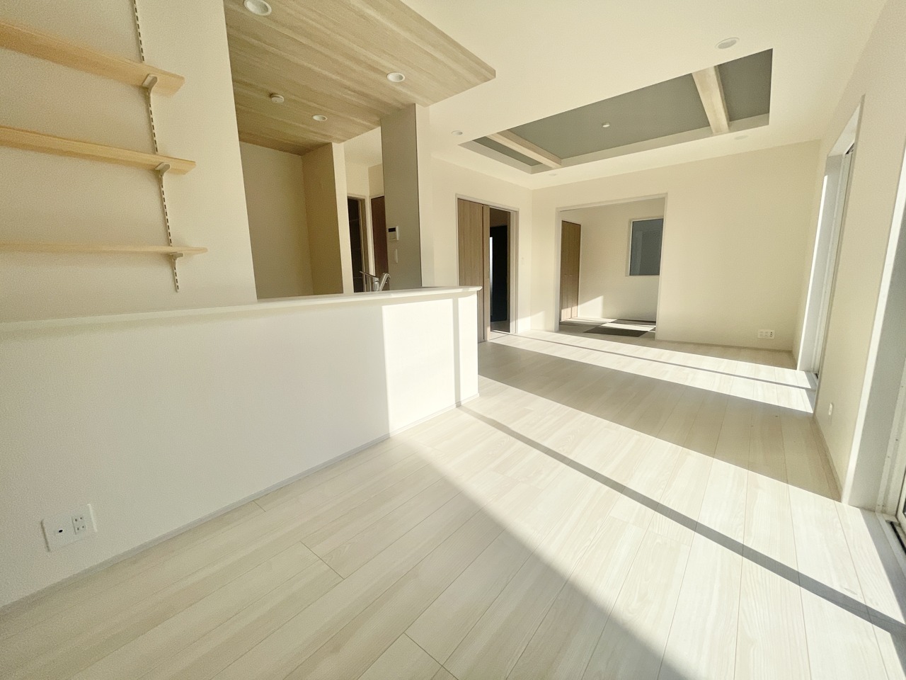2号棟 視界が広がるワイドなリビング空間は、小さなお子様がいても見守りやすい設計。キッチンからもリビングを見渡せ、家族の気配を感じながら家事ができます。