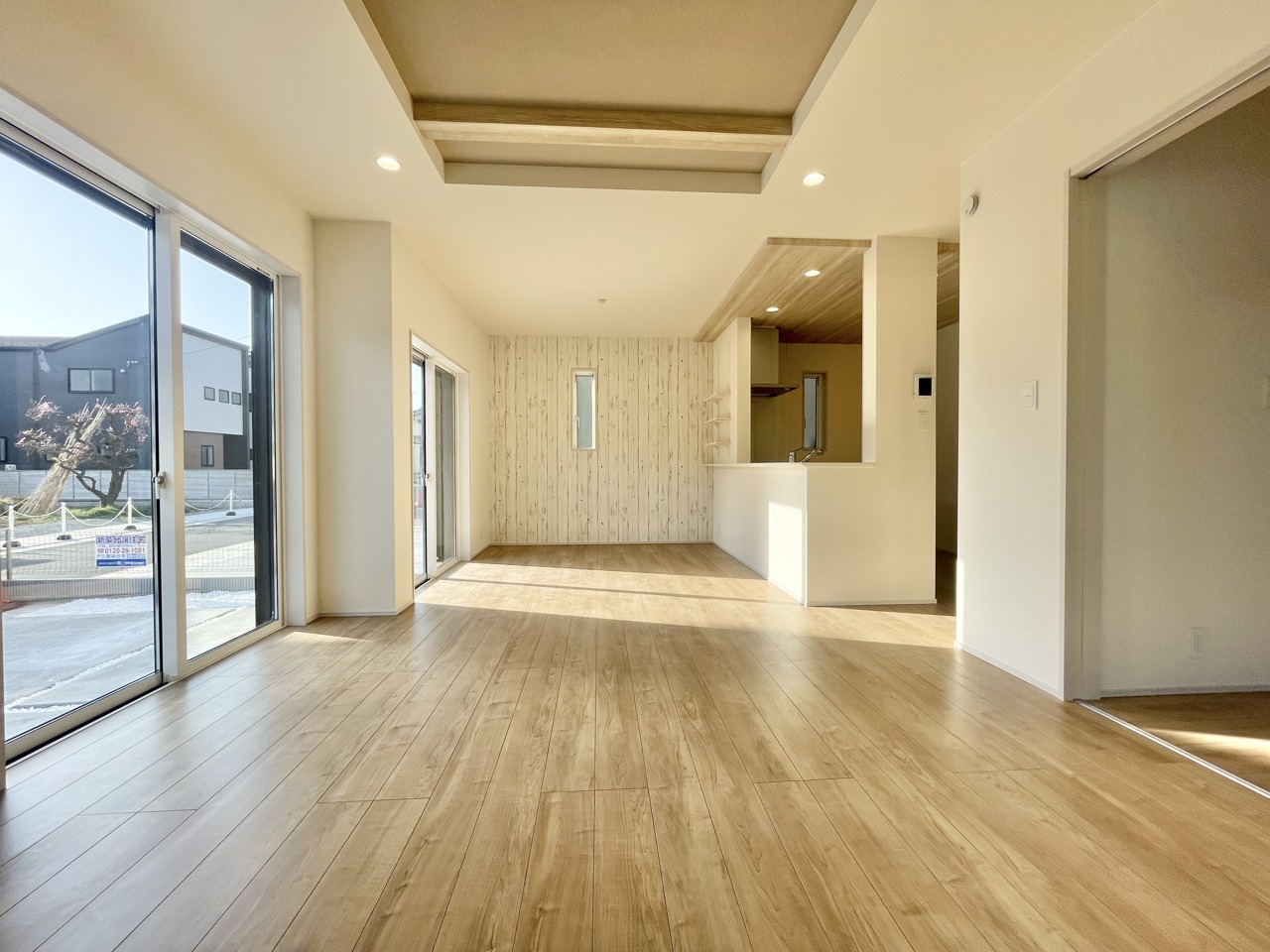 2号棟 ゆったり広がるリビングに、木目天井のぬくもりがほっと心地いい空間。家族の「ただいま」が楽しみになる住まいです。