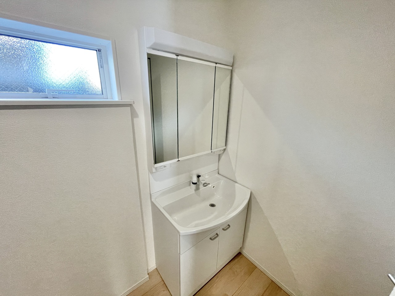 三面鏡は真正面から見ただけでは気付けない色んな角度から確認でき、収納スペースが豊富であるということがメリットです。 また、シャワーヘッド付きの水栓です。