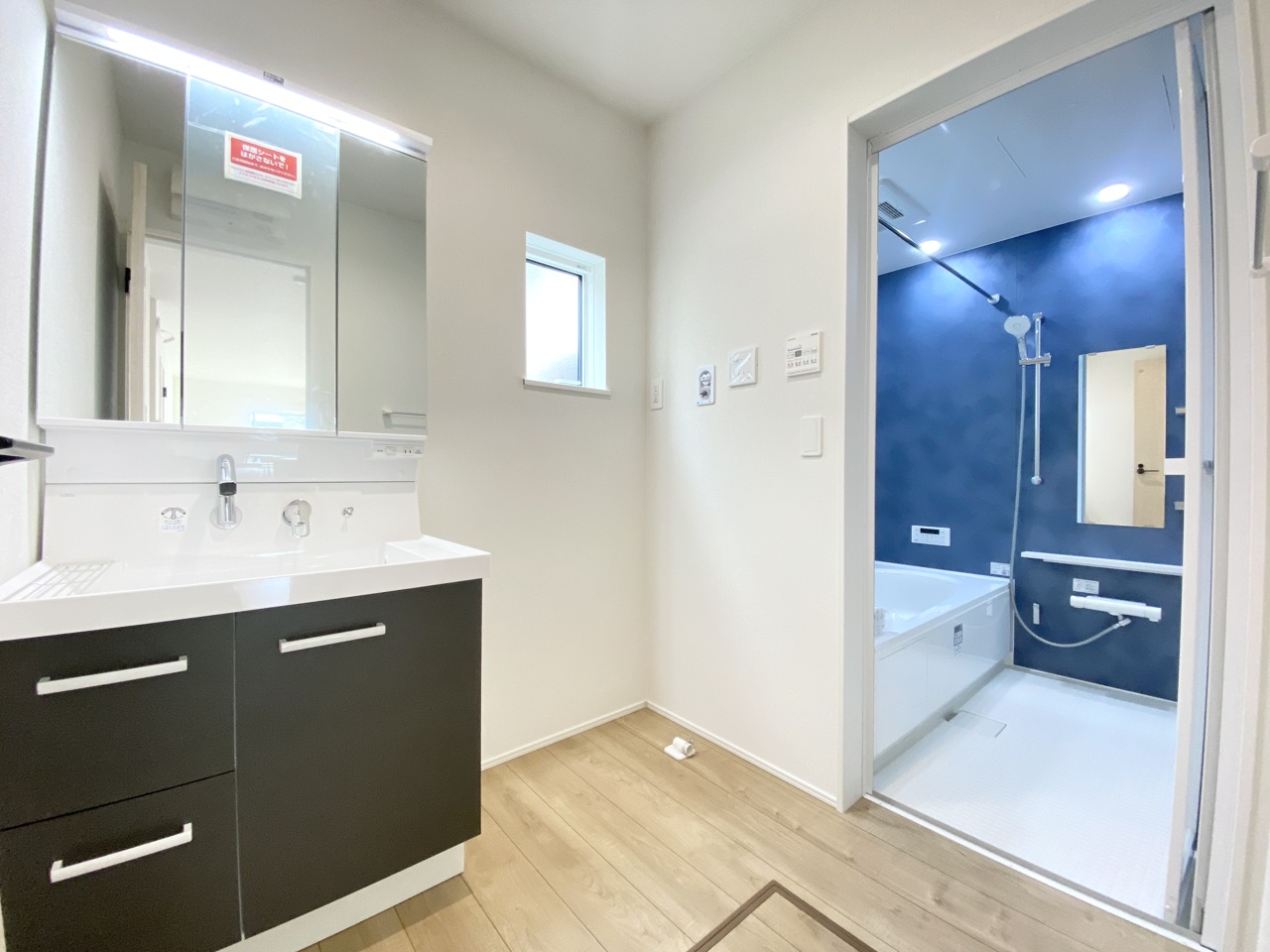 広々洗面所 ■三面鏡洗面台 シャワーヘッド付き 三面鏡は真正面から見ただけでは気付けない色んな角度から確認でき、収納スペースが豊富であるということがメリットです。また、シャワーヘッド付きの水栓です。ミラー扉の内側がすべて収納スペースになっています。