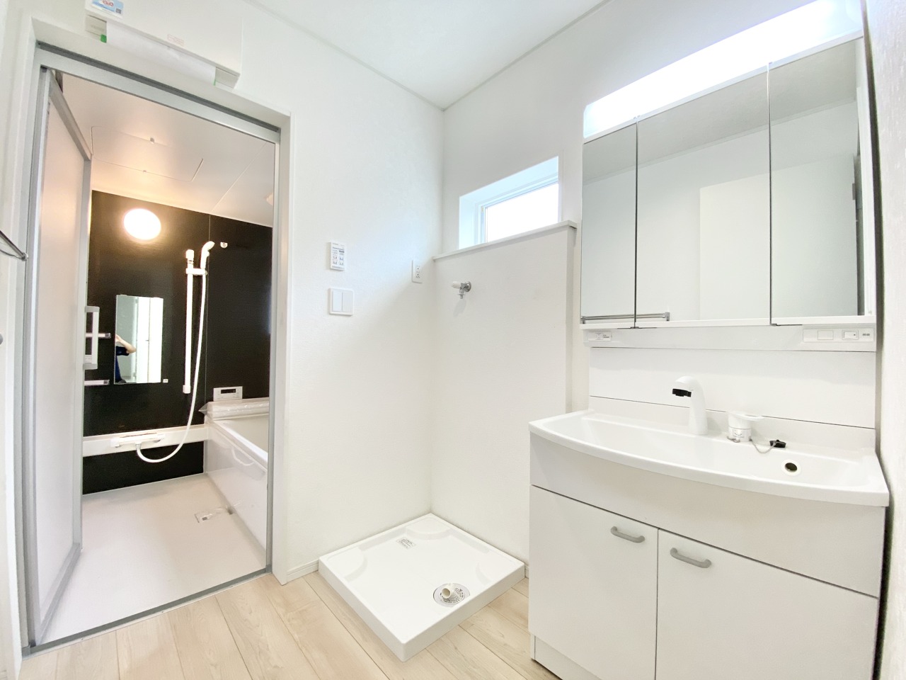 三面鏡は真正面から見ただけでは気付けない色んな角度から確認でき、収納スペースが豊富であるということがメリットです。 また、シャワーヘッド付きの水栓です。