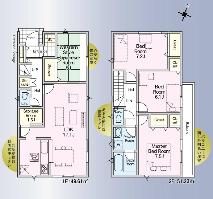 | 間取 | 4SLDK (和室5帖、LDK17.1帖、洋室7.5帖、洋室7.2帖、洋室6.1帖) | ||