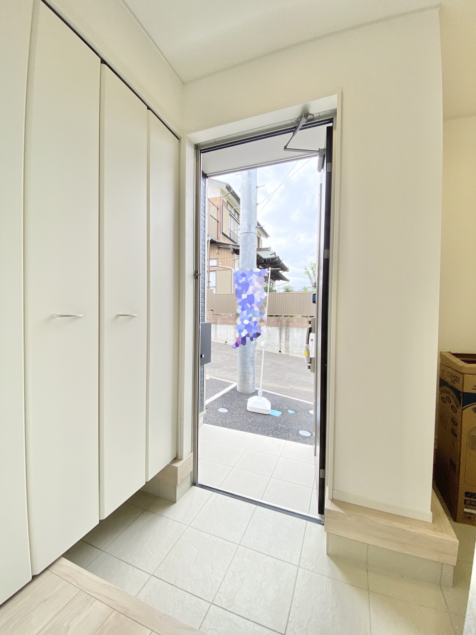 ■玄関 ゆとりのある玄関です。 シューズの収納もでき、カウンター台もあるので、飾り棚に使用したりもできます。