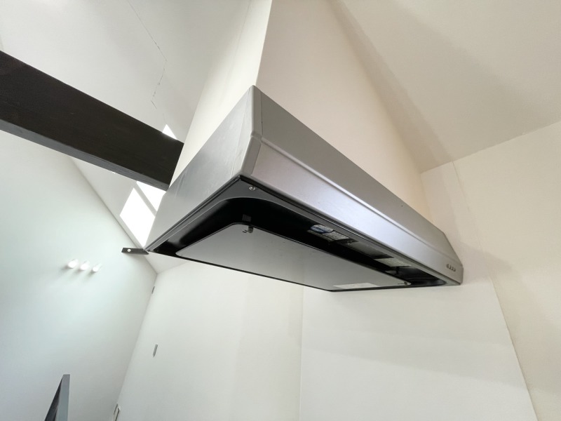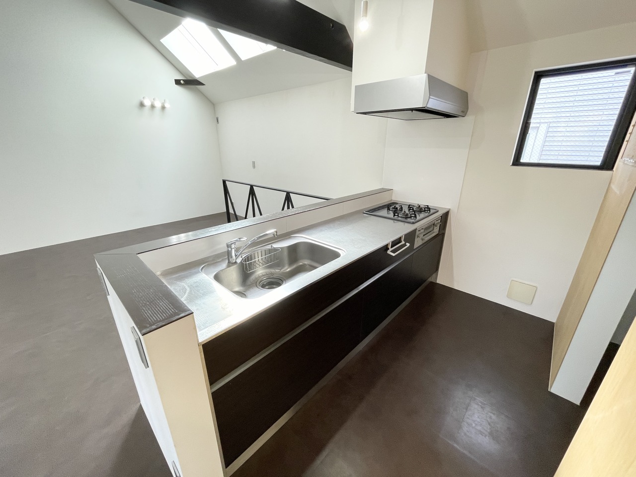 吹き抜けと梁が演出する、遊び心あるデザイナーズキッチン。 天窓からの光と、ダークな梁が印象的な勾配天井が、カフェのような雰囲気を醸し出します。スキップフロア構造で、料理をしながら家族と会話が弾む空間です。