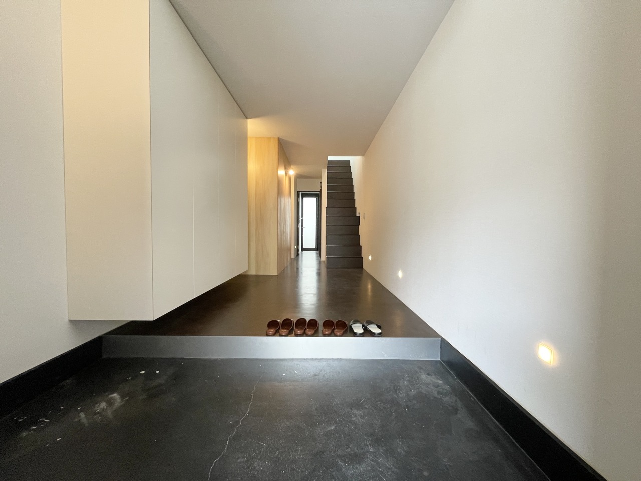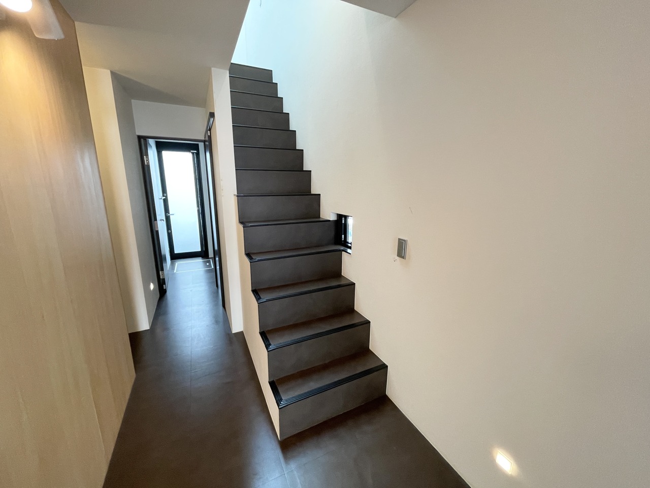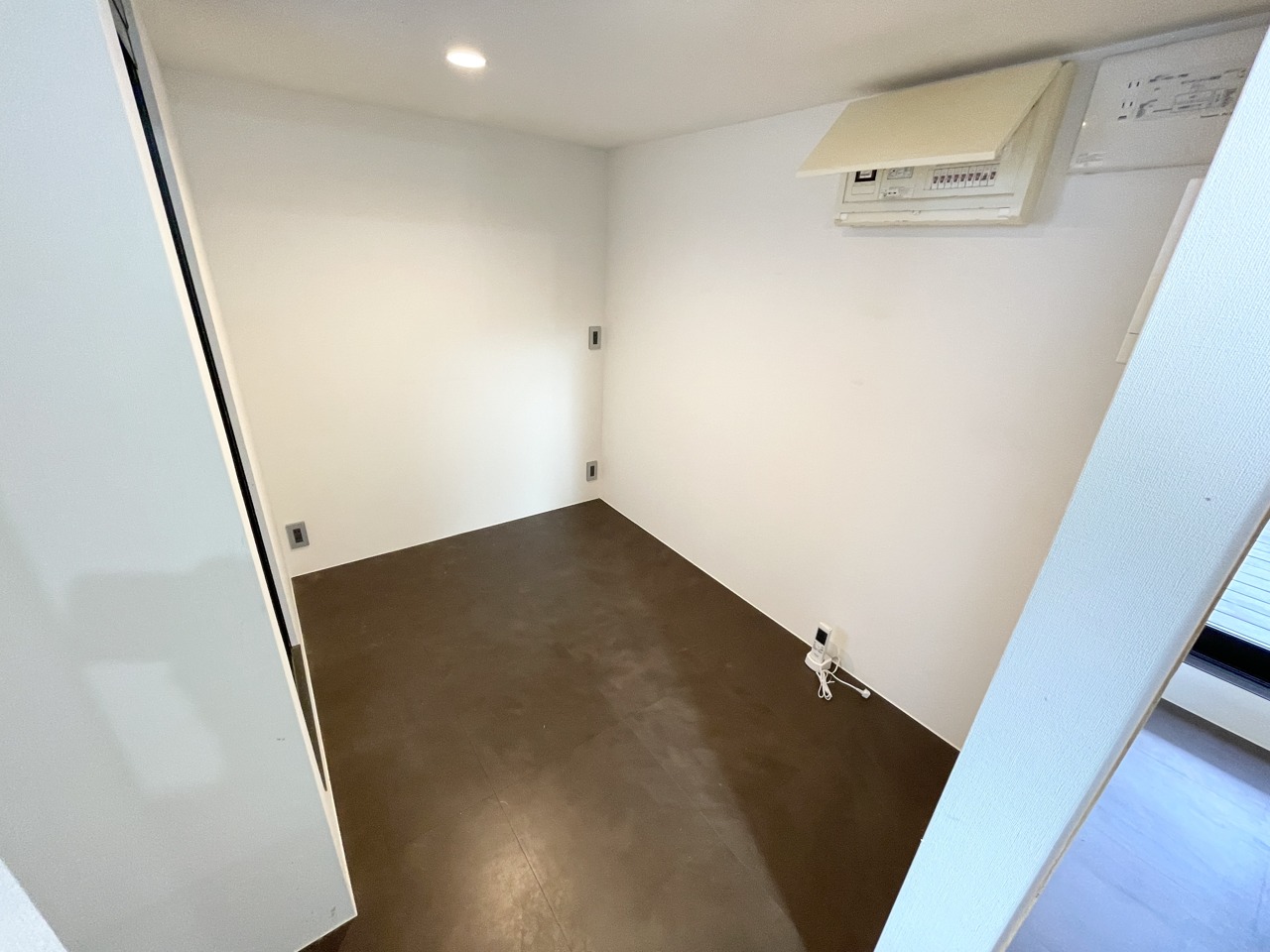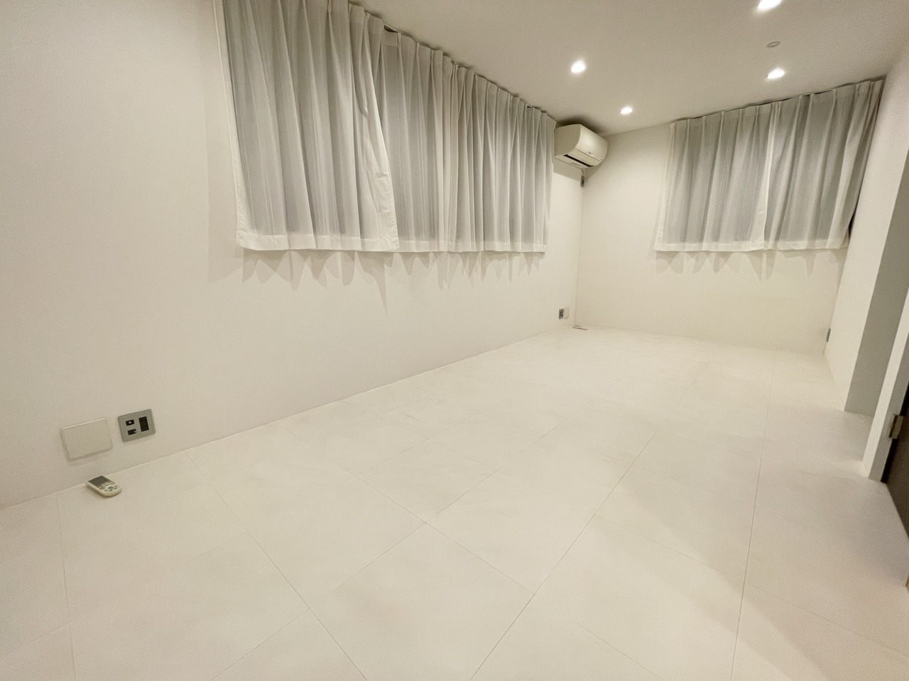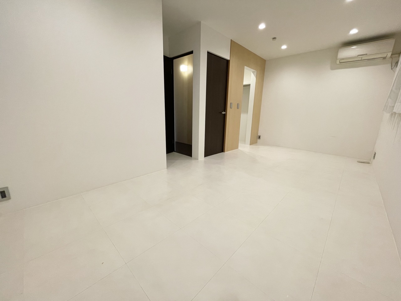 光沢のあるタイル調フロアが美しい、洗練されたプライベート空間。 真っ白な壁と床が清潔感と開放感を演出。ナチュラルな木目とダークトーンの扉が、モダンなアクセントに。どんなインテリアにも馴染む、自由度の高い一部屋です。