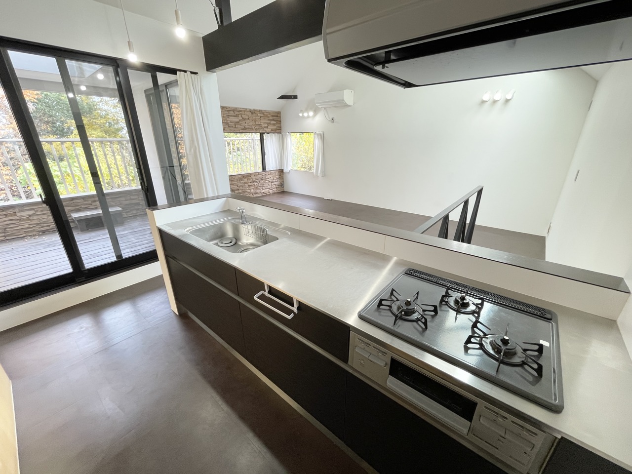 吹き抜けの開放感と自然が溶け合う家。 スタイリッシュな対面キッチンと、視界いっぱいに広がるウッドデッキが魅力。緑を眺めながら料理を楽しみ、ロフト風の空間でくつろぐ。家族の笑顔が生まれる、遊び心あるデザイナーズハウス。