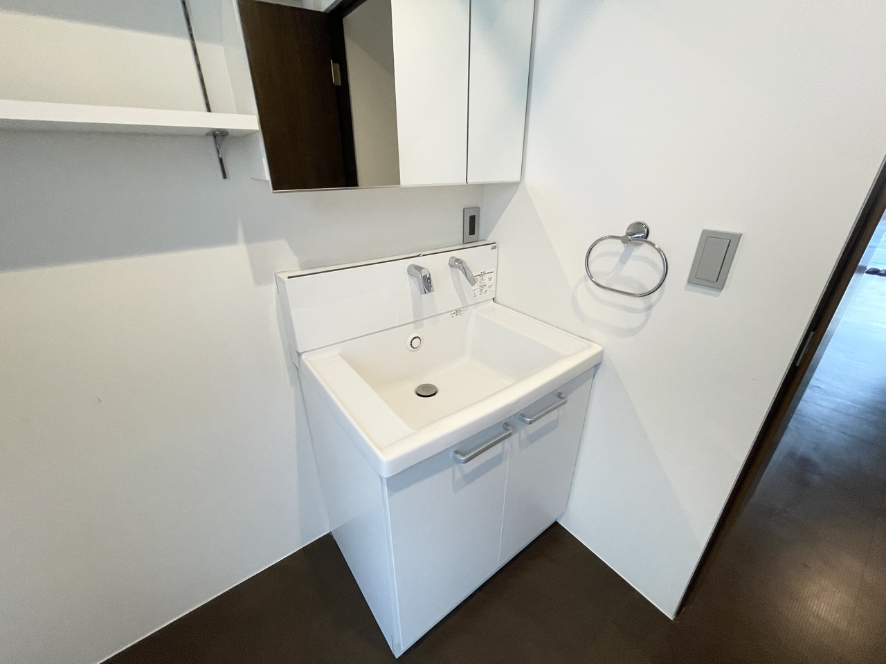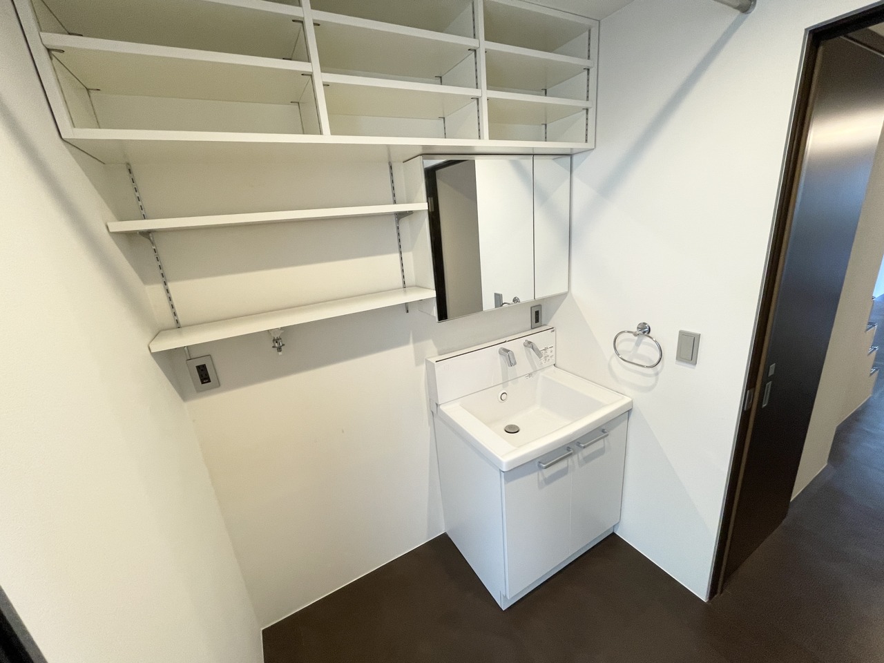 毎日の準備がスムーズに。収納力のあるサニタリースペース。 大きな鏡付き洗面台の上には、タオルや化粧品をたっぷりしまえる可動棚を完備。すっきり片付くから、朝の忙しい時間も快適です。清潔感あふれる空間で、気持ちの良い一日を!