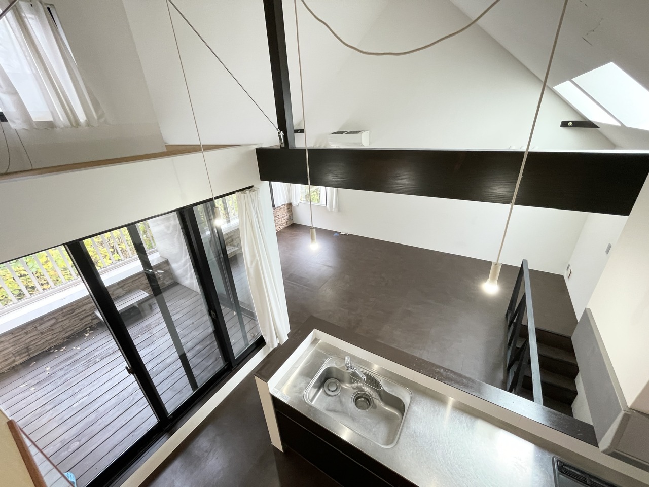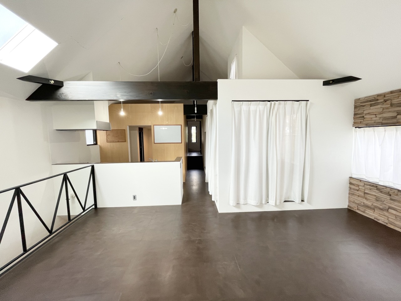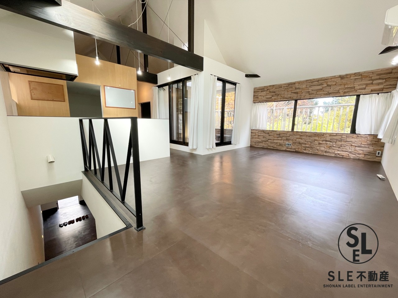 視覚的な開放感と木の温もり。光と風が戯れるデザイナーズ空間。 スキップフロアと吹き抜けが、暮らしに立体的な広がりを演出。天窓からの陽光と、アクセントウォールの石積み風デザインが、上質なリゾート感を醸し出します。