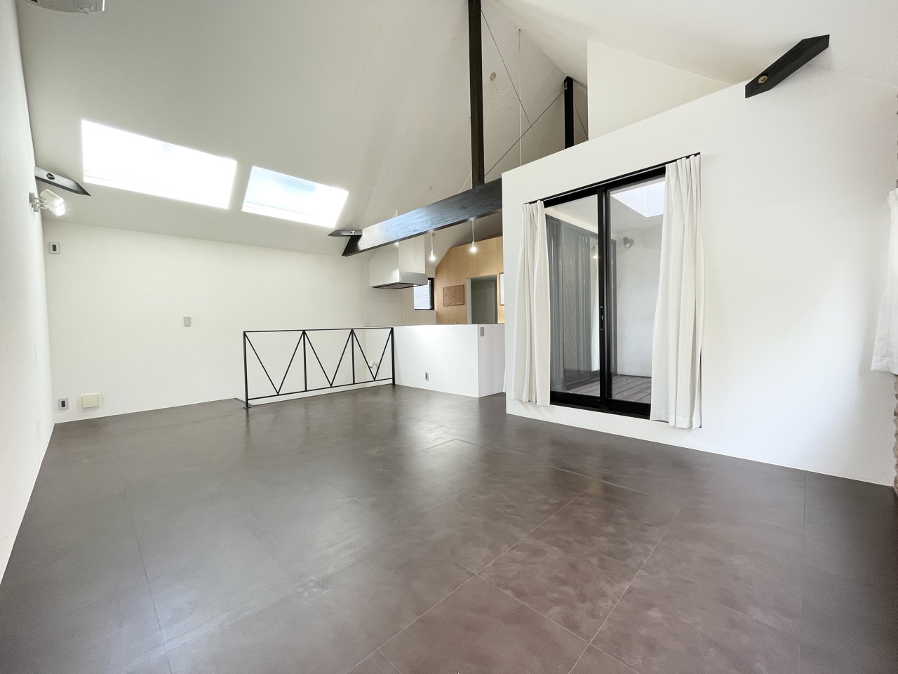 吹き抜けと天窓が叶える、光と風の特等席。 勾配天井と大胆な梁、スキップフロアが織りなす、ダイナミックな空間デザイン。高い位置からの採光が、室内を一日中明るく照らします。非日常的な開放感に包まれて暮らす贅沢。